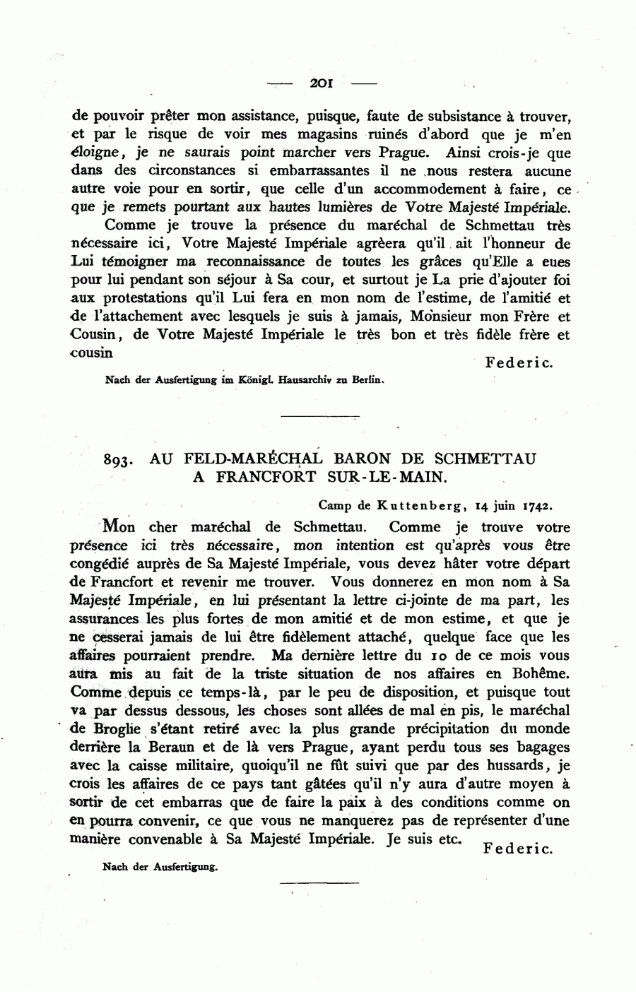 893. AU FELD-MARÉCHAL BARON DE SCHMETTAU A FRANCFORT SUR-LE-MAIN.