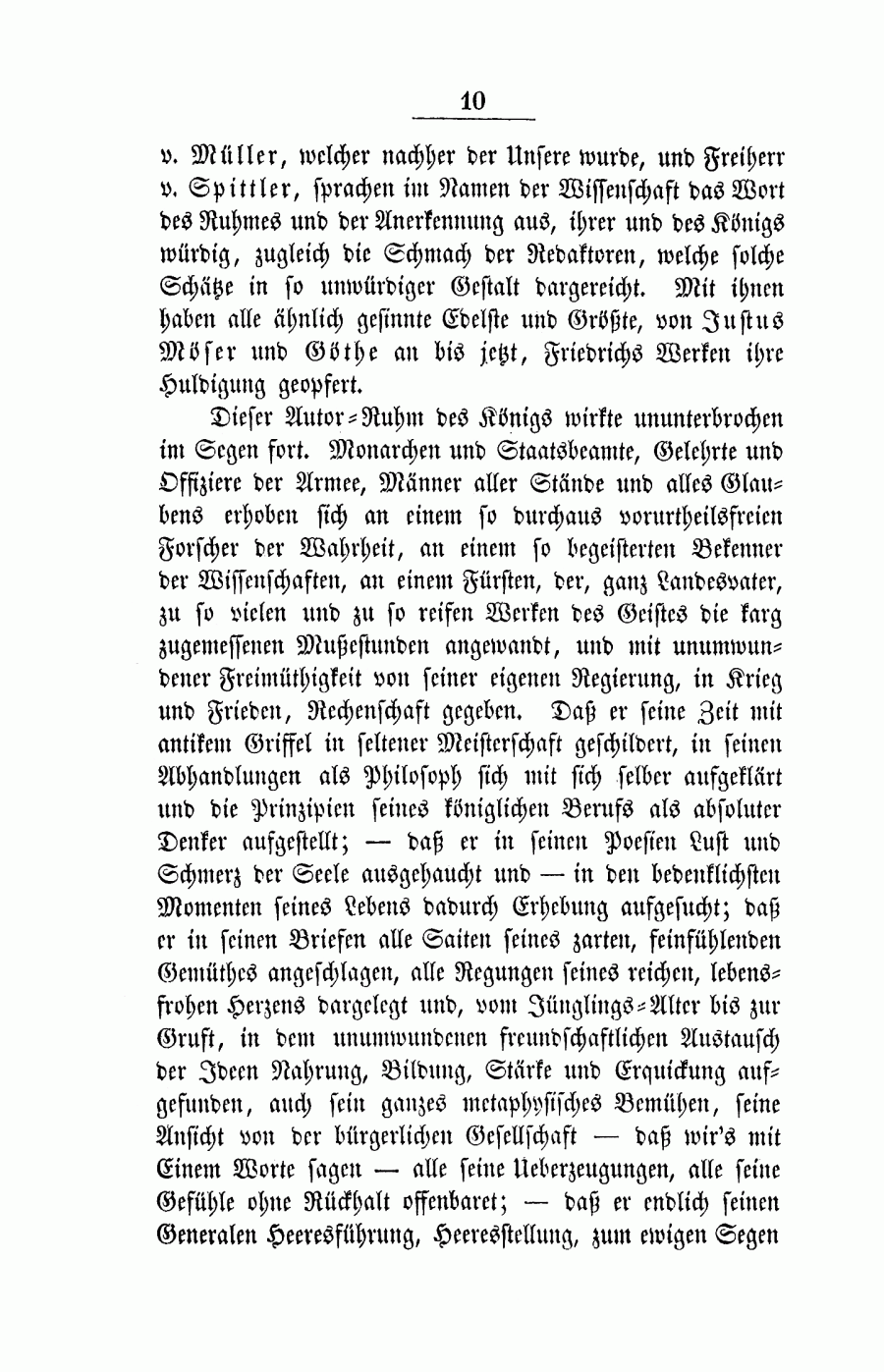 Dieser Autor-Ruhm des Königs wirkte ununterbrochen im Segen fort. Monarchen und Staatsbeamte, Gelehrte und Offiziere der Armee, Männer aller Stände und alles Glaubens erhoben sich an einem so durchaus vorurtheilsfreien Forscher der Wahrheit, an einem so begeisterten Bekenner der Wissenschaften, an einem Fürsten, der, ganz Landesvater, zu so vielen und zu so reifen Werken des Geistes die karg zugemessenen Mußestunden angewandt, und mit unumwundener Freimüthigkeit von seiner eigenen Regierung, in Krieg und Frieden, Rechenschaft gegeben. Daß er seine Zeit mit antikem Griffel in seltener Meisterschaft geschildert, in seinen Abhandlungen als Philosoph sich mit sich selber aufgeklärt und die Prinzipien seines königlichen Berufs als absoluter Denker aufgestellt; - daß er in seinen Poesien Lust und Schmerz der Seele ausgehaucht und - in den bedenklichsten Momenten seines Lebens dadurch Erhebung aufgesucht; daß er in seinen Briefen alle Saiten seines zarten, feinfühlenden Gemüthes angeschlagen, alle Regungen seines reichen, lebensfrohen Herzens dargelegt und, vom Jünglings-Alter bis zur Gruft, in dem unumwundenen freundschaftlichen Austausch der Ideen Nahrung, Bildung, Stärke und Erquickung aufgefunden, auch sein ganzes metaphysisches Bemühen, seine Ansicht von der bürgerlichen Gesellschaft - daß wir's mit Einem Worte sagen - alle seine Überzeugungen, alle seine Gefühle ohne Rückhalt offenbaret; - daß er endlich seinen Generalen Heeresführung, Heeresstellung, zum ewigen Segen