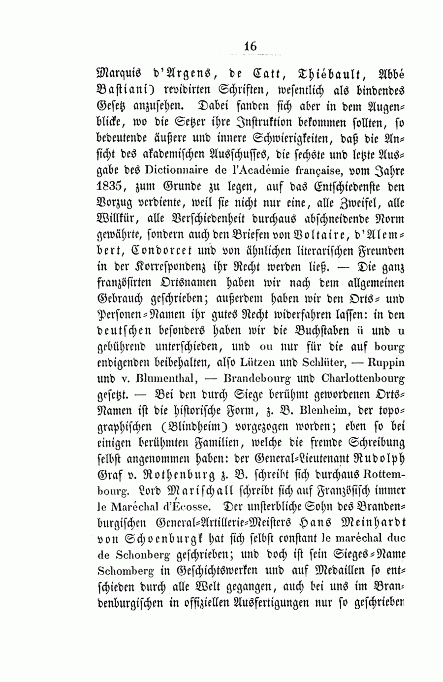 <16>Marquis d'Argens, de Catt, Thiébault, Abbé Bastiani) revidirten Schriften, wesentlich als bindendes Gesetz anzusehen. Dabei fanden sich aber in dem Augenblicke, wo die Setzer ihre Instruktion bekommen sollten, so bedeutende äußere und innere Schwierigkeiten, daß die Ansicht des akademischen Ausschusses, die sechste und letzte Ausgabe des Dictionnaire de l'académie française, vom Jahre 1835, zum Grunde zu legen, auf das Entschiedenste den Vorzug verdiente, weil sie nicht nur eine, alle Zweifel, alle Willkür, alle Verschiedenheit durchaus abschneidende Norm gewährte, sondern auch den Briefen von Voltaire, d'Alembert, Condorcet und von ähnlichen literarischen Freunden in der Korrespondenz ihr Recht werden ließ. - Die ganz französirten Ortsnamen haben wir nach dem allgemeinen Gebrauch geschrieben; außerdem haben wir dm Orts- und Personen-Namen ihr gutes Recht widerfahren lassen: in den deutschen besonders haben wir die Buchstaben ü und u gebührend unterschieden, und ou nur für die auf bourg endigenden beibehalten, also Lützen und Schlüter - Ruppin und v. Blumenthal, - Brandebourg und Charlottenbourg gesetzt. - Bei den durch Siege berühmt gewordenen Orts-Namen ist die historische Form, z. B. Blenheim, der topographischen (Blindheim) vorgezogen worden; eben so bei einigen berühmten Familien, welche die fremde Schreibung selbst angenommen haben: der General-Lieutenant Rudolph Graf v. Rothenburg z. B. schreibt sich durchaus Rottembourg. Lord Marischall schreibt sich auf Französisch immer le Maréchal d'Écosse. Der unsterbliche Sohn des Brandenburgischen General-Artillerie-Meisters Hans Meinhardt von Schoenburgk hat sich selbst constant le maréchal duc de Schonberg geschrieben; und doch ist sein Sieges-Name Schomberg in Geschichtswerken und auf Medaillen so entschieden durch alle Welt gegangen, auch bei uns im Brandenburgischen in offiziellen Ausfertigungen nur so geschrieben