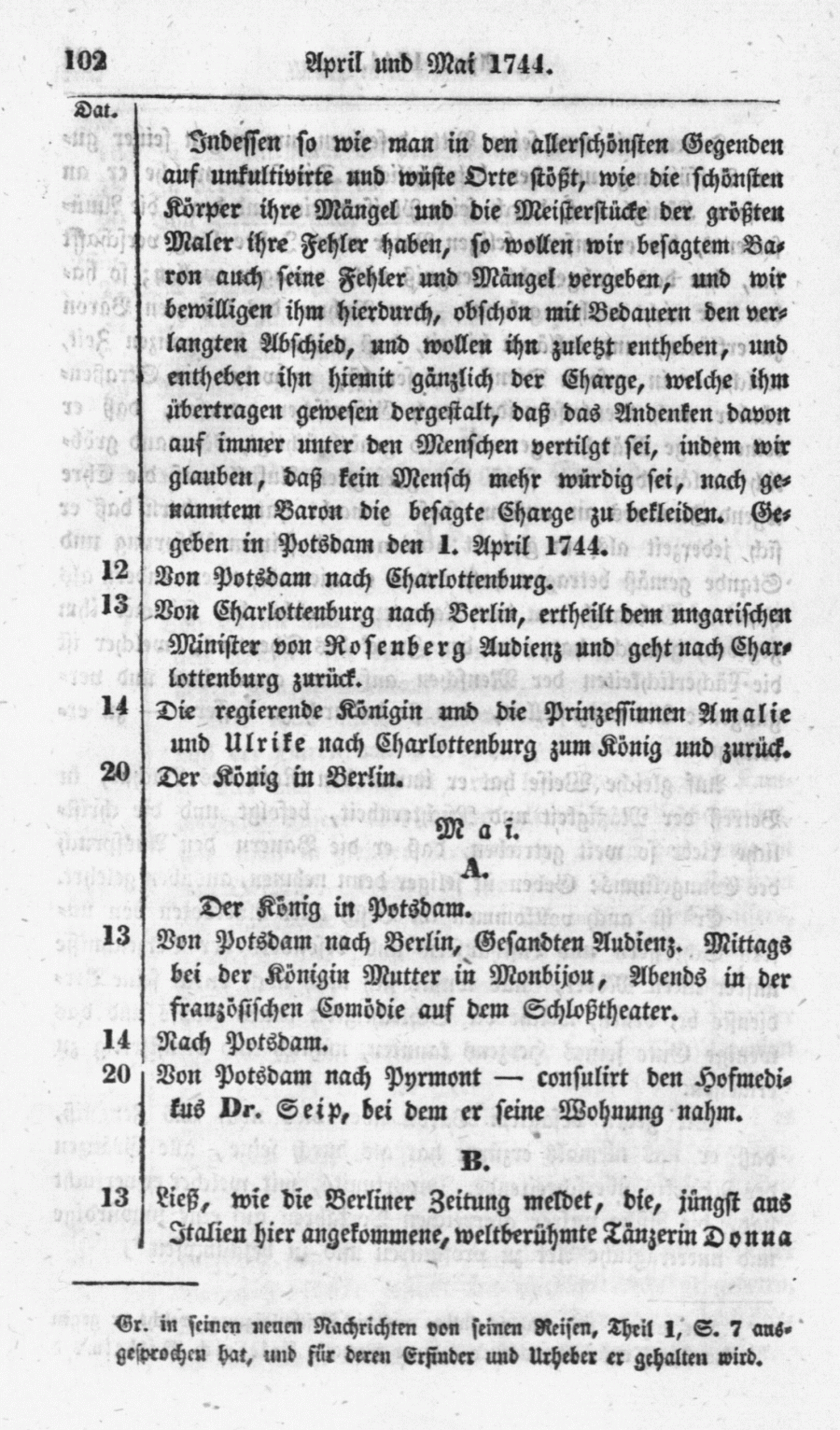 Indessen so wie man in den allerschönsten Gegenden auf unkultivirte und wüste Orte stößt, wie die schönsten Körper ihre Mängel und die Meisterstücke der größten Maler ihre Fehler haben, so wollen wir besagtem Baron auch seine Fehler und Mängel vergeben, und wir bewilligen ihm hierdurch, obschon mit Bedauern den verlangten Abschied, und wollen ihn zuletzt entheben, und entheben ihn hiemit gänzlich der Charge, welche ihm übertragen gewesen dergestalt, daß das Andenken davon auf immer unter den Menschen vertilgt sei, indem wir glauben, daß kein Mensch mehr würdig sei, nach genanntem Baron die besagte Charge zu bekleiden. Gegeben in Potsdam den 1. April 1744.