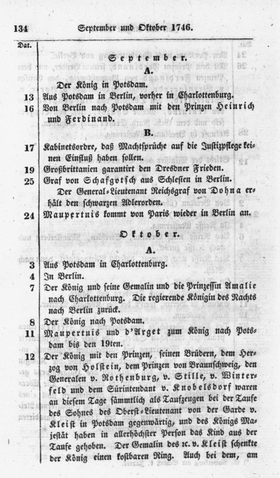 Der König mit den Prinzen, seinen Brüdern, dem Herzog von Holstein, dem Prinzen von Braunschweig, den Generalen v. Rothenburg, v. Stille, v. Winterfeld und dem Sürintendant v. Knobelsdorf waren an diesem Tage sämmtlich als Taufzeugen bei der Taufe des Sohnes des Oberst-Lieutenant von der Garde v. Kleist in Potsdam gegenwärtig, und des Königs Majestät haben in allerhöchster Person das Kind aus der Taufe gehoben. Der Gemalin des etc. v. Kleist schenkte der König einen kostbaren Ring. Auch bei dem, am