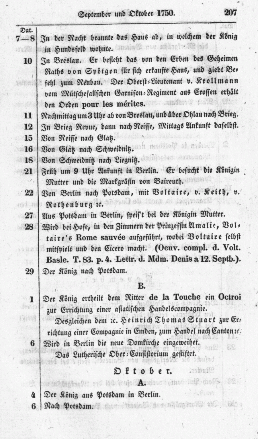 Wird bei Hofe, in den Zimmern der Prinzessin Amalie, Voltaire's Rom sauvée aufgeführt, wobei Voltaire selbst mitspielt und den Cicero macht. (Oeuv. compl. d. Volt. Basle. T. 83. p. 4. Lettr. d. Mdm. Denis a 12. Septb.).