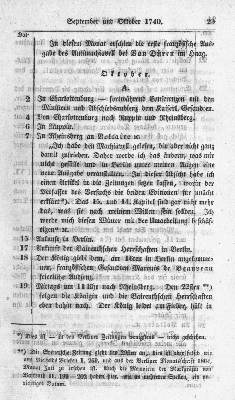 ++ Die Spenersche Zeitung gibt an, dies ist aber falsch wie aus Bielfelds Briefen I. 269, und aus der Berliner Monatsschrift 1804, Monat Juli zu ersehen ist. Auch die Memoiren der Markgräfin von Baireuth II. 199-202 haben hier, wie an mehreren Stellen, ein unrichtiges Datum.
