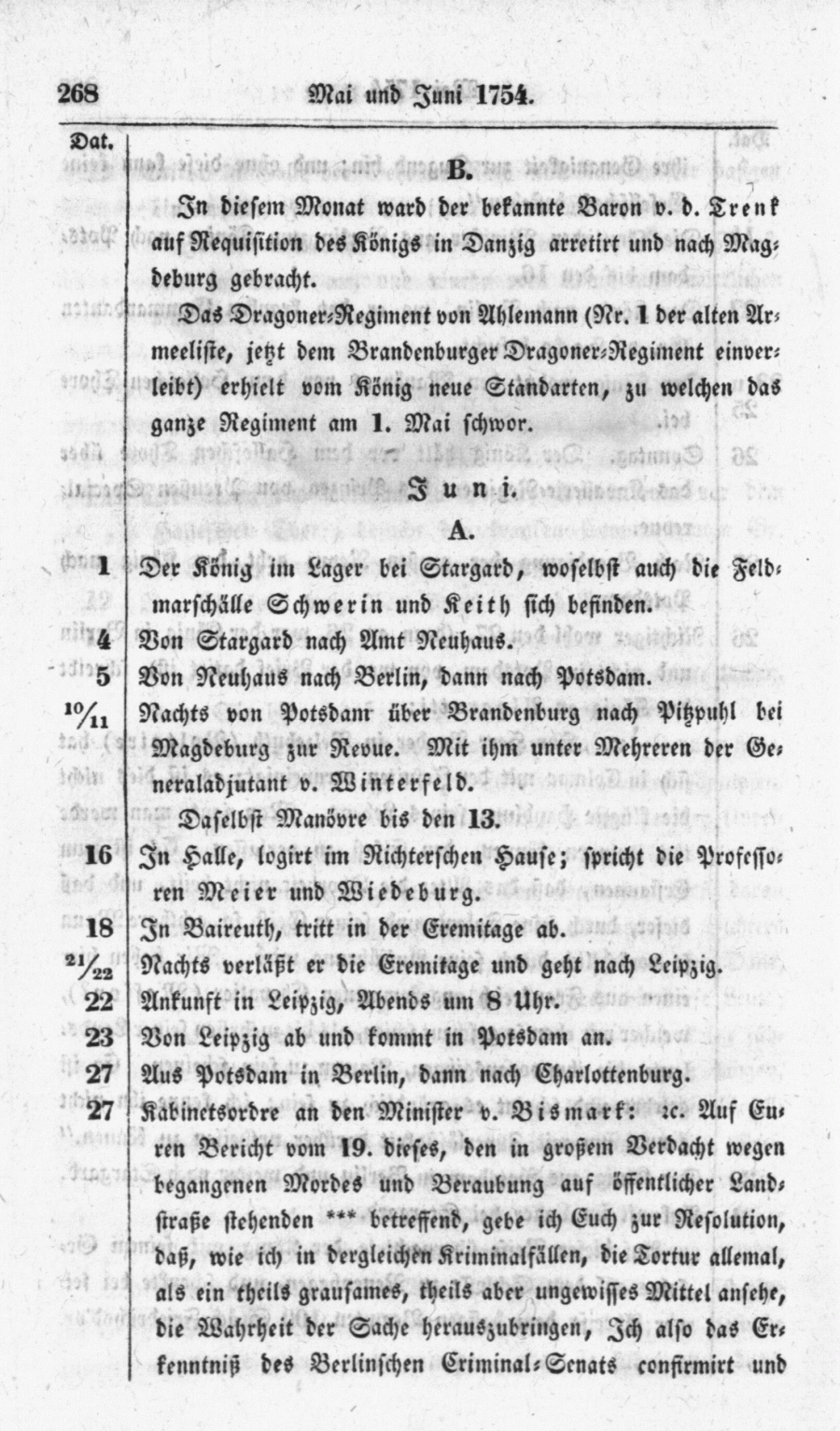 Kabinetsordre an den Minister v. Bismark: etc. Auf Euren Bericht vom 19. dieses, den in großem Verdacht wegen begangenen Mordes und Beraubung auf öffentlicher Landstraße stehenden *** betreffend, gebe ich Euch zur Resolution, daß, wie ich in dergleichen Kriminalfällen, die Tortur allemal, als ein theils grausames, theils aber Ungewisses Mittel ansehe, die Wahrheit der Sache herauszubringen, Ich also das Erkenntniß des Berlinschen Criminal-Senats confirmirt und
