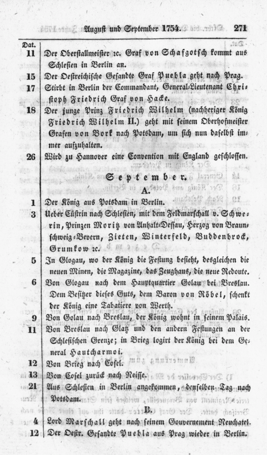 Der junge Prinz Friedrich Wilhelm (nachheriger König Friedrich Wilhelm II.) geht mit seinem Oberhofmeister Grafen von Bork nach Potsdam, um sich nun daselbst immer aufzuhalten.