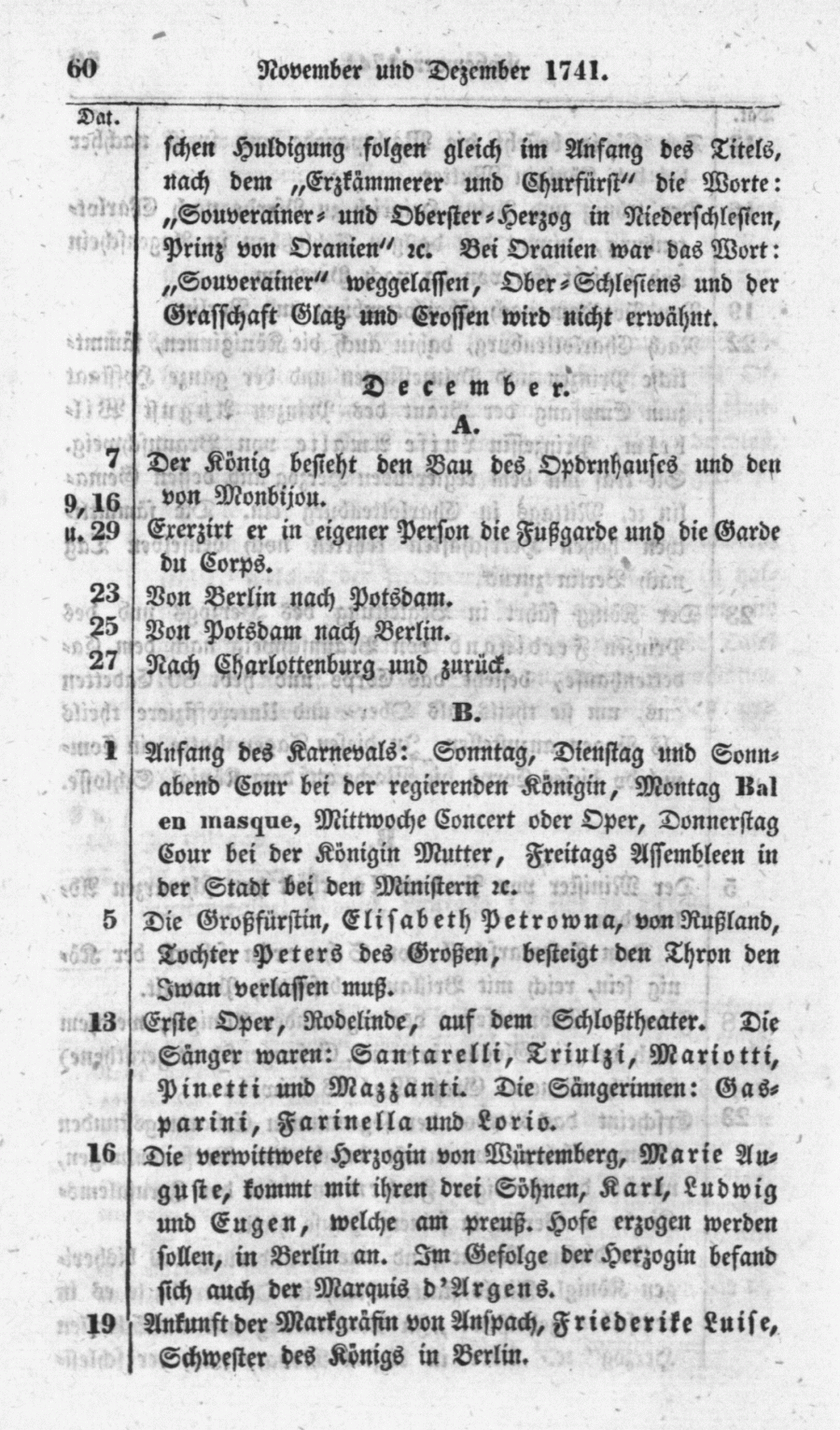 Anfang des Karnevals: Sonntag, Dienstag und Sonnabend Cour bei der regierenden Königin, Montag Bal en masque, Mittwoche Concert oder Oper, Donnerstag Cour bei der Königin Mutter, Freitags Assembleen in der Stadt bei den Ministern etc.