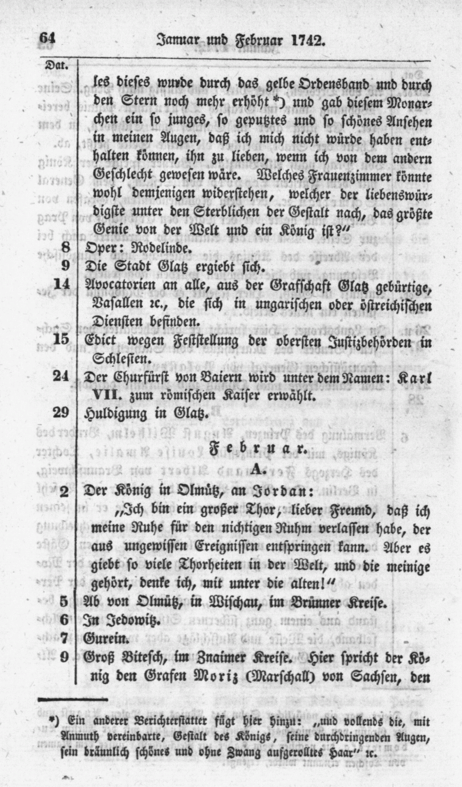 "<64>les dieses wude durch das gelbe Ordensband und durch den Stern noch mehr erhöht + und gab diesem Monarchen ein so junges, so geputztes und so schönes Ansehen in meinen Augen, daß ich mich nicht würde haben enthalten können, ihn zu lieben, wenn ich von dem andern Geschlecht gewesen wäre. Welches Frauenzimmer könnte wohl demjenigen widerstehen, welcher der liebenswürdigste unter den Sterblichen der Gestalt nach, das größte Genie von der Welt und ein König ist?"