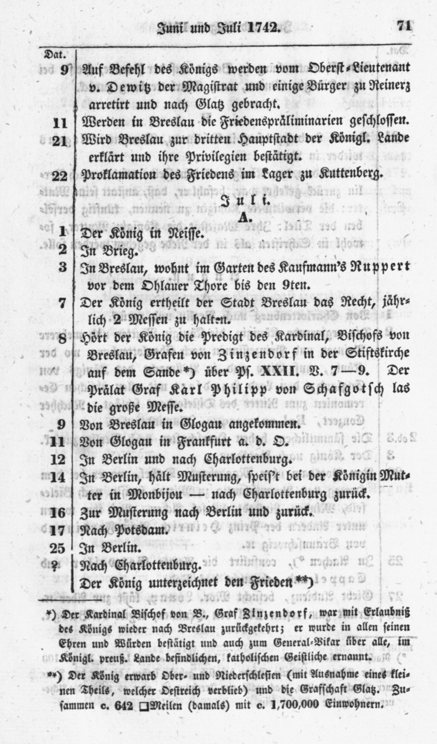 + Der Kardinal Bischof von V., Graf Zinzendorf, war mit Erlaubniß des Königs wieder nach Breslau zurückgekehrt; er wurde in allen seinen Ehren und Würden bestätigt und auch zum General-Vikar über alle, im Königl. preuß. Lande befindlichen, katholischen Geistliche ernannt.