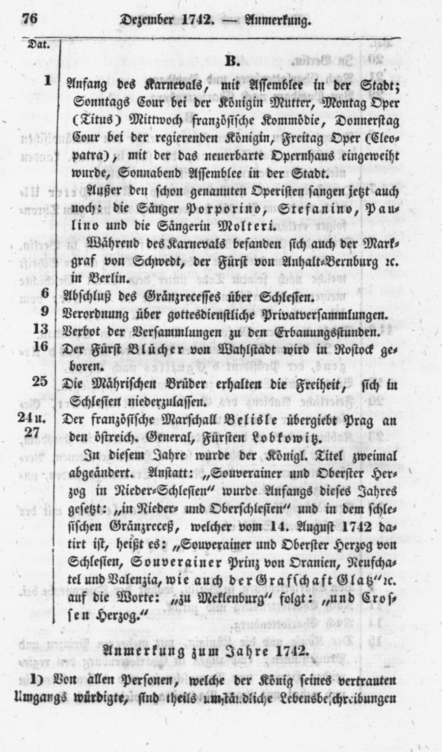 In diesem Jahre wurde der Königl. Titel zweimal abgeändert. Anstatt: "Souverainer und Oberster Herzog in Nieder-Schlesien" wurde Anfangs dieses Jahres gesetzt: "in Nieder- und Oberschlesien" und in dem schlesischen Gränzreceß, welcher vom 14. August 1742 datirt ist, heißt es: "Souverainer und Oberster Herzog von Schlesien, Souverainer Prinz von Oranien, Neufchatel und Valenzia, wie auch der Grafschaft Glatz" etc. auf die Worte: "zu Meklenburg" folgt: "und Crossen Herzog."