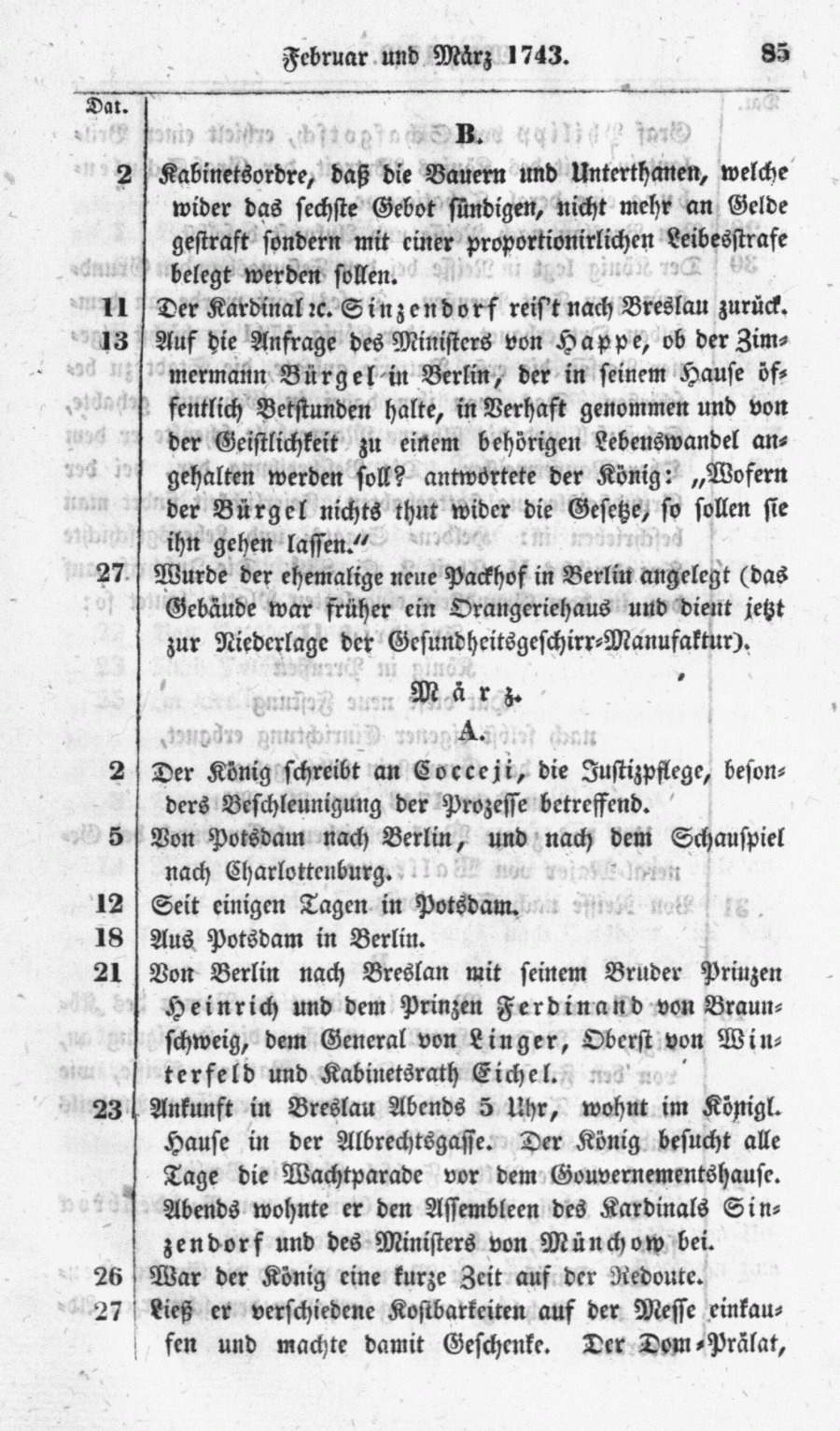 Ankunft in Breslau Abends 5 Uhr, wohnt im Königl. Hause in der Albrechtsgasse. Der König besucht alle Tage die Wachtparade vor dem Gouvernementshause. Abends wohnte er den Assembleen des Kardinals Sinzendorf und des Ministers von Münchow bei.