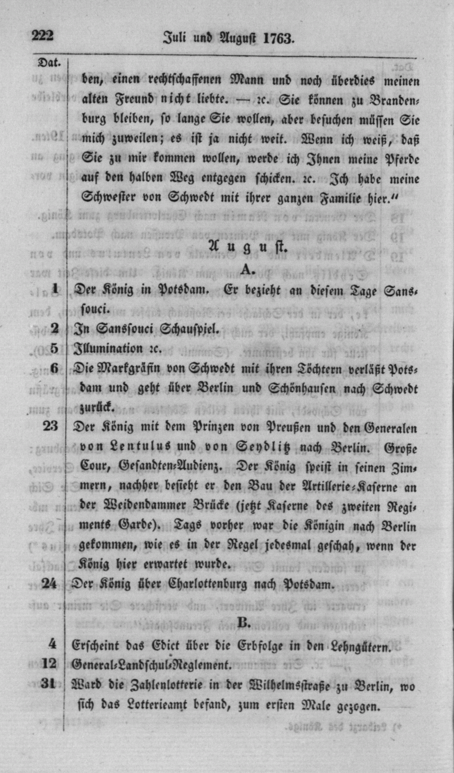 Der König mit dem Prinzen von Preußen und den Generalen von Lentulus und von Seydlitz nach Berlin. Große Cour, Gesandten-Audienz. Der König speist in seinen Zimmern, nachher besieht er den Bau der Artillerie-Kaserne an der Weidendammer Brücke (jetzt Kaserne des zweiten Regments Garde). Tags vorher war die Königin nach Berlin gekommen, wie es in der Regel jedesmal geschah, wenn der Konig hier erwartet wurde.