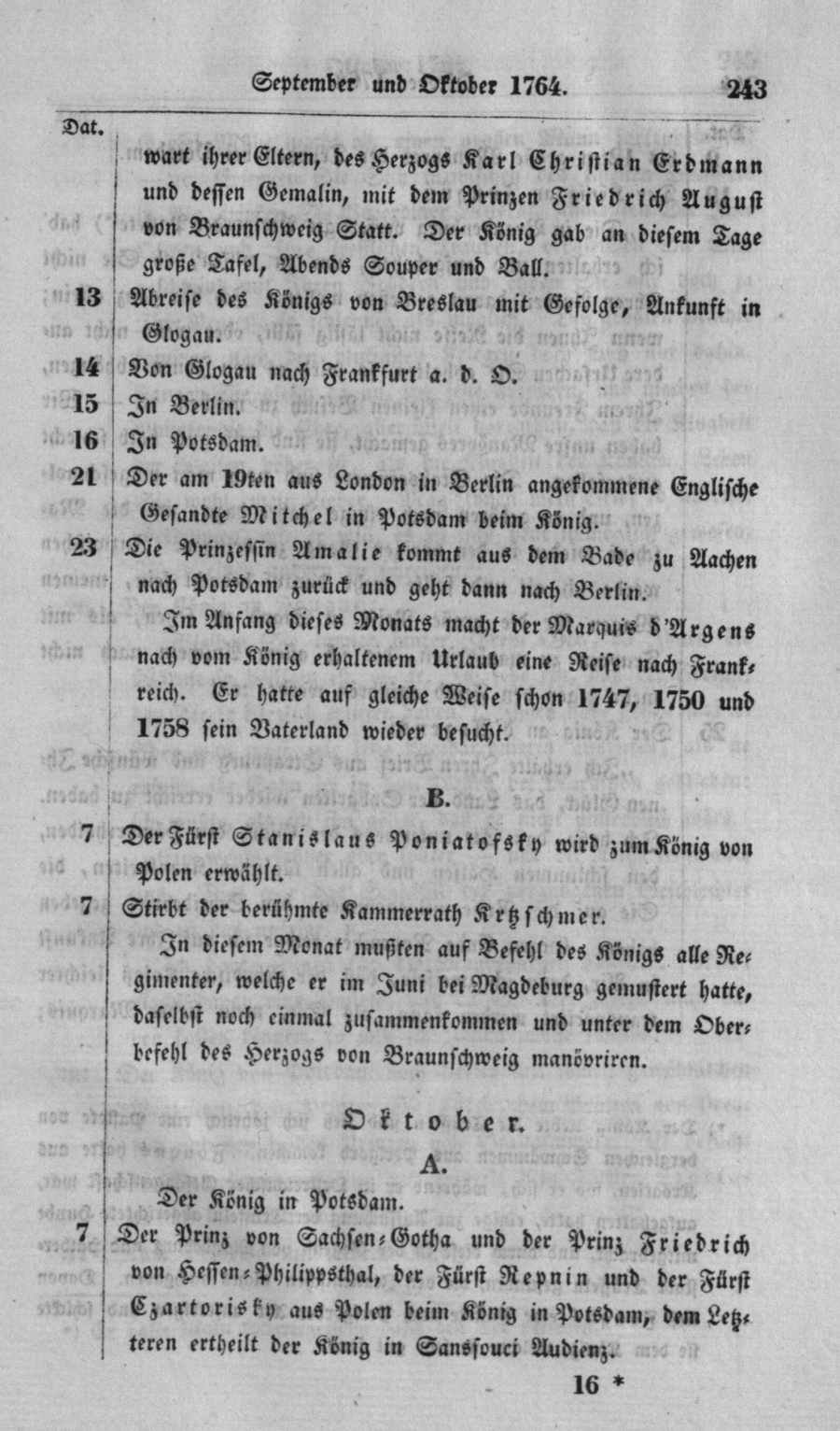 <243>wart ihrer Eltern, des Herzogs Karl Christian Erdmann und dessen Gemalin, mit dem Prinzen Friedrich August von Braunschweig Statt. Der König gab an diesem Tage große Tafel, Abends Souper und Ball.