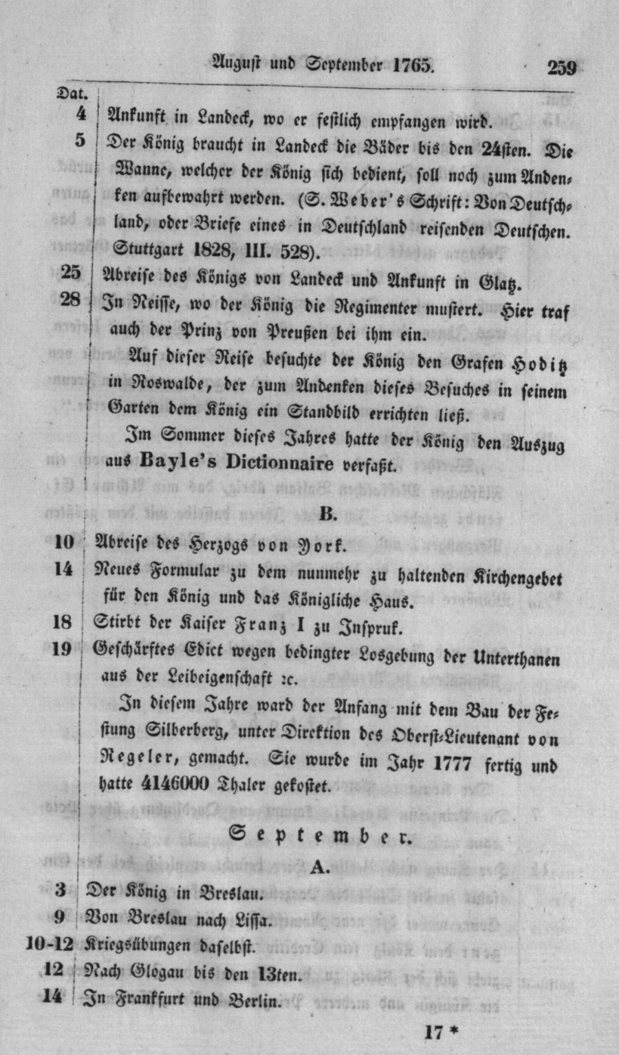 Der König braucht in Landeck die Bäder bis den 24sten. Die Wanne, welcher der König sich bedient, soll noch zum Andenken aufbewahrt werden. (S. Weber's Schrift : Von Deutschland, oder Briefe eines in Deutschland reisenden Deutschen. Stuttgart 188, III. 528).