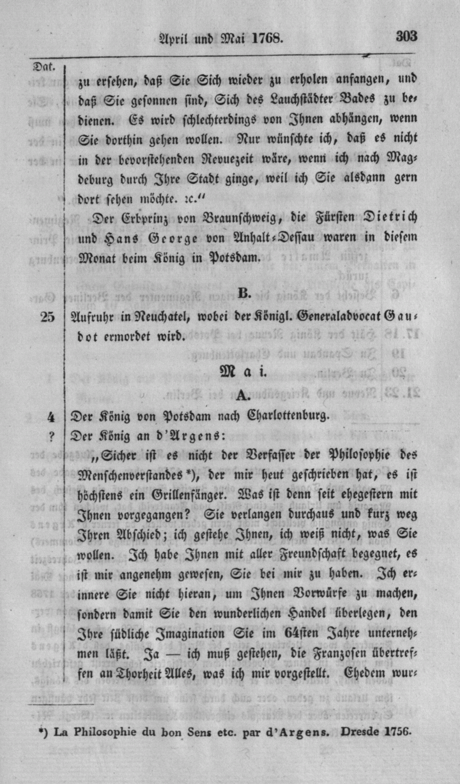 "Sicher ist es nicht der Verfasser der Philosophie des Menschenverstandes +, der mir heut geschrieben hat, es ist höchstens ein Grillenfänger. Was ist denn seit ehegestern mit Ihnen vorgegangen? Sie verlangen durchaus und kurz weg Ihren Abschied; ich gestehe Ihnen, ich weiß nicht, was Sie wollen. Ich habe Ihnen mit aller Freundschaft begegnet, es ist mir angenehm gewesen, Sie bei mir zu haben. Ich erinnere Sie nicht hieran, um Ihnen Vorwürfe zu machen, sondern damit Sie den wunderlichen Handel überlegen, den Ihre südliche Imagination Sie im 64sten Jahre unternehmen läßt. Ja — ich muß gestehen, die Franzosen übertreffen an Thorheit Alles, was ich mir vorgestellt. Ehedem wur-"