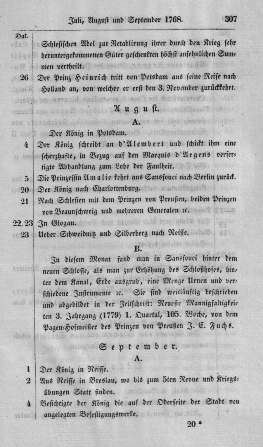 In diesem Monat fand man in Sanssouci hinter dem neuen Schlosse, als man zur Erhöhung des Schloßhofes, hinter dem Kanal, Erde ausgrub, eine Menge Urnen und verschiedene Instrumente etc. Sie sind weitläuftig beschrieben und abgebildet in der Zeitschrift: Neueste Mannigfaltigkeiten 3. Jahrgang (1779) 1. Quartal, 105. Woche, von dem Pagen-Hofmeister des Prinzen von Preußen J. C. Fuchs.