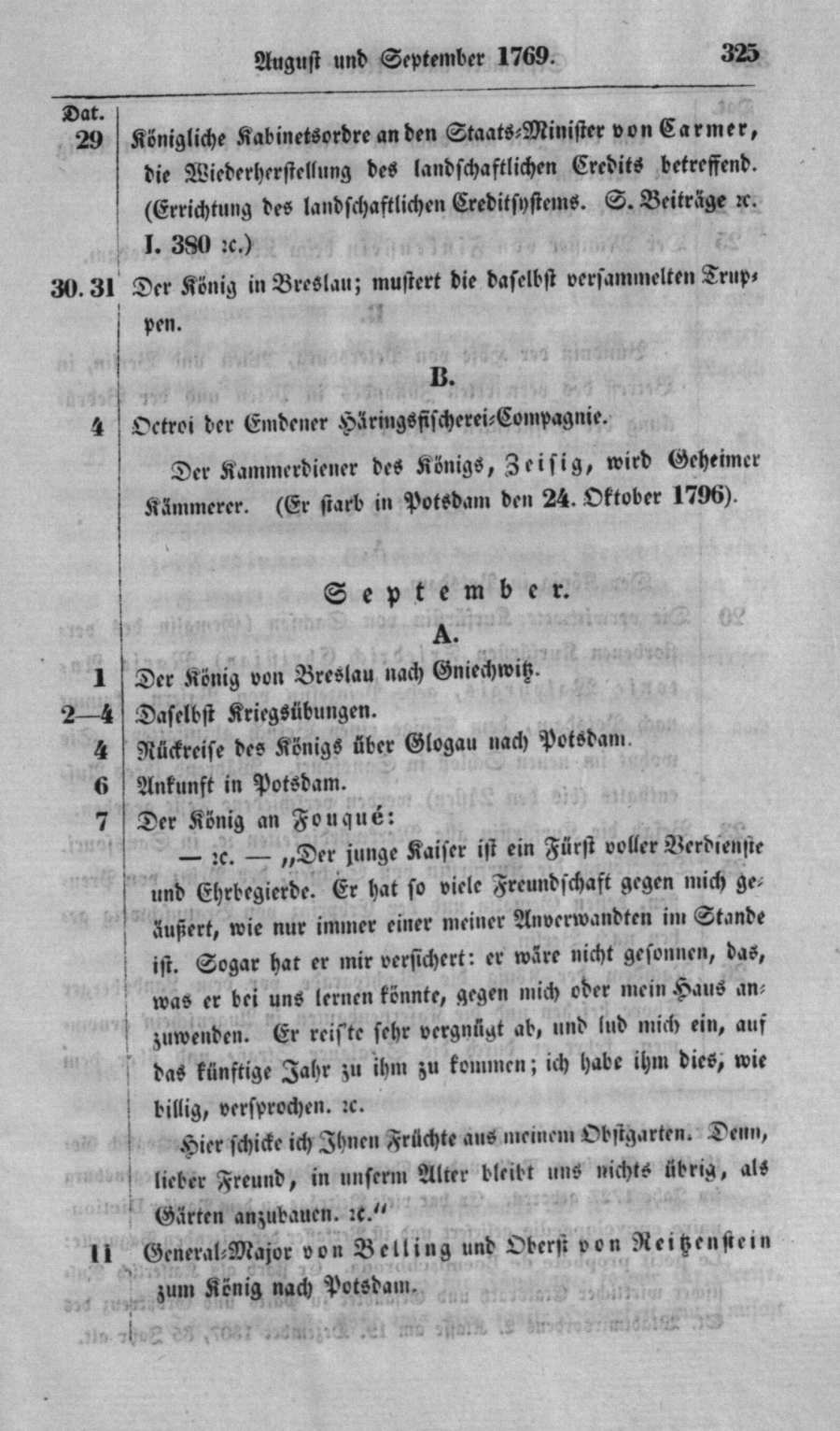 Octroi der Emdener Häringsfischerei-Compagnie. Der Kammerdiener des Königs, Zeisig, wird Geheimer Kämmerer. (Er starb in Potsdam den 24. Oktober 1796).