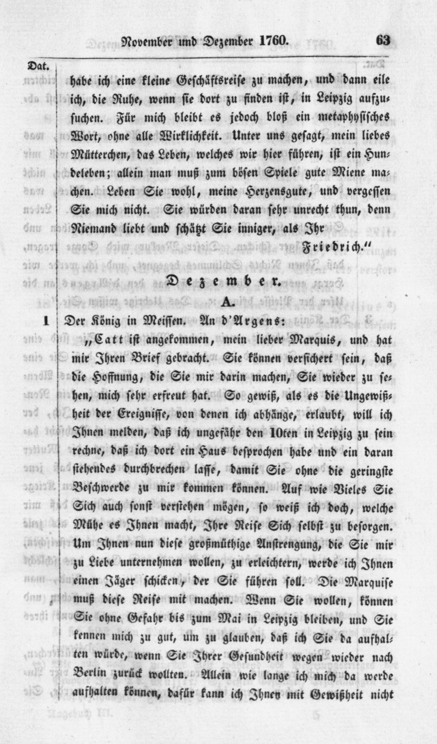 "Catt ist angekommen, mein lieber Marquis, und hat mir Ihren Brief gebracht. Sie können versichert sein, daß die Hoffnung, die Sie mir darin machen, Sie wieder zu sehen, mich sehr erfreut hat. So gewiß, als es die Ungewißheit der Ereignisse, von denen ich abhänge, erlaubt, will ich Ihnen melden, daß ich ungefähr den 10ten in Leipzig zu sein rechne, daß ich dort ein Haus besprochen habe und ein daran stehendes durchbrechen lasse, damit Sie ohne die geringste Beschwerde zu mir kommen können. Auf wie Vieles Sie Sich auch sonst verstehen mögen, so weiß ich doch, welche Mühe es Ihnen macht, Ihre Reise Sich selbst zu besorgen. Um Ihnen nun diese großmüthige Anstrengung, die Sie mir zu Liebe unternehmen wollen, zu erleichtern, werde ich Ihnen einen Jäger schicken, der Sie führen soll. Die Marquise muß diese Reise mit machen. Wenn Sie wollen, können Sie ohne Gefahr bis zum Mai in Leipzig bleiben, und Sie kennen mich zu gut, um zu glauben, daß ich Sie da aufhalten würde, wenn Sie Ihrer Gesundheit wegen wieder nach Berlin zurück wollten. Allein wie lange ich mich da werde aufhalten können, dafür kann ich Ihnen mit Gewißheit nicht