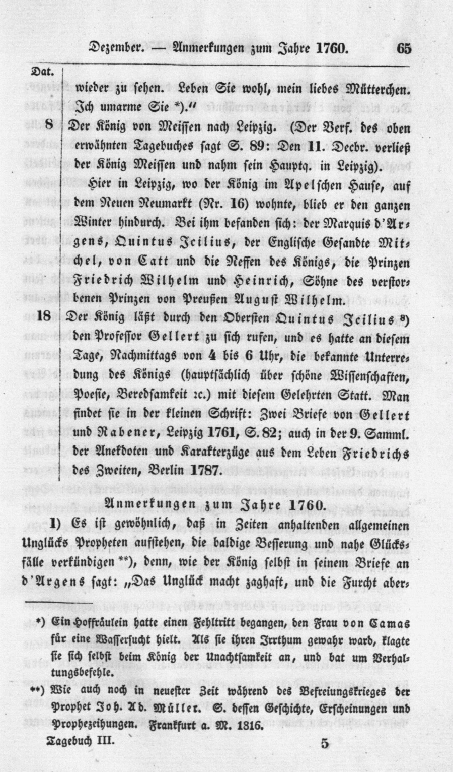 Der König läßt durch den Obersten Quintus Icilius 8) den Professor Gellert zu sich rufen, und es hatte an diesem Tage, Nachmittags von 4 bis 6 Uhr, die bekannte Unterredung des Königs (hauptsächlich über schöne Wissenschaften, Poesie, Beredsamkeit etc.) mit diesem Gelehrten Statt. Man findet sie in der kleinen Schrift: Zwei Briefe von Gellert und Rabener, Leipzig 1761, S.82; auch in der 9. Samml. der Anekdoten und Karakterzüge aus dem Leben Friedrichs des Zweiten, Berlin 1787.