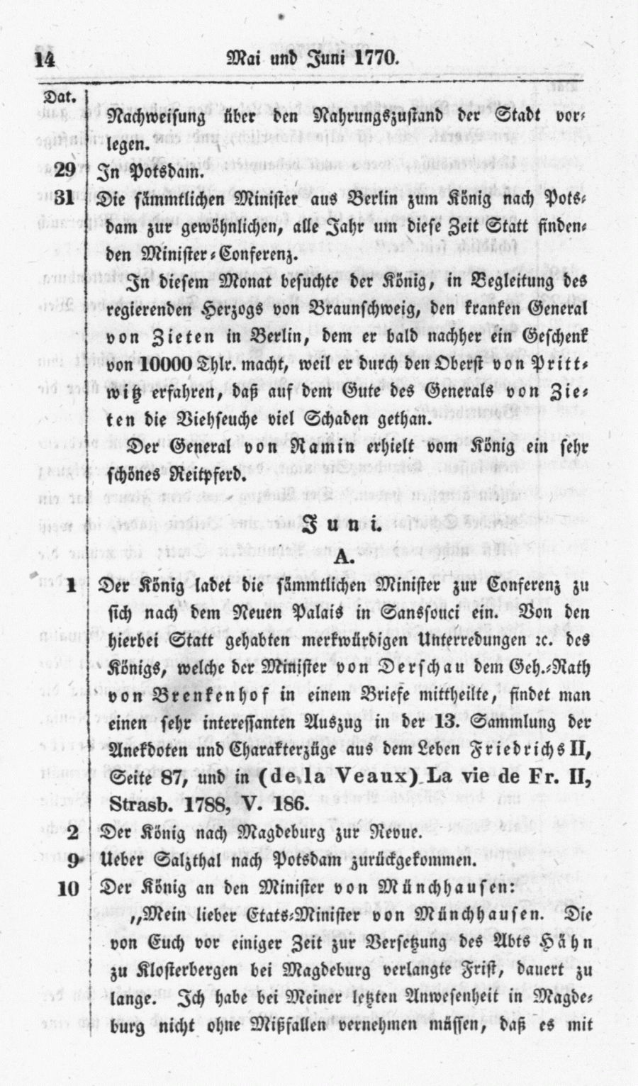 Der König ladet die sämmtlichen Minister zur Conferenz zu sich nach dem Neuen Palais in Sanssouci ein. Von den hierbei Statt gehabten merkwürdigen Unterredungen etc. des Königs, welche der Minister von Derschau dem Geh.-Rath von Brenkenhof in einem Briefe mittheilte, findet man einen sehr interessanten Auszug in der 13. Sammlung der Anekdoten und Charakterzüge aus dem Leben Friedrichs II, Seite 87, und in (de la Veaux) La vie de Fr. II, Strasb. 1788, V. 186.