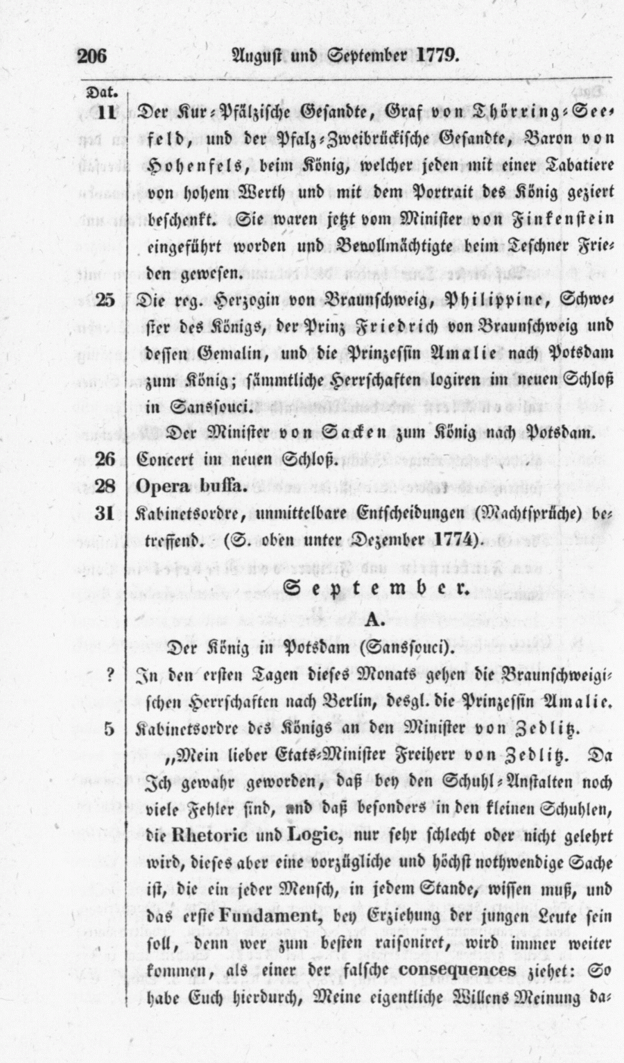 Kabinetsordre des Königs an den Minister von Zedlitz. "Mein lieber Etats-Minister Freiherr von Zedlitz. Da Ich gewahr geworden, daß bey den Schuhl-Anstalten noch viele Fehler sind, und daß besonders in den kleinen Schuhlen, die Rhetoric und Logic, nur sehr schlecht oder nicht gelehrt wird, dieses aber eine vorzügliche und höchst nothwendige Sache ist, die ein jeder Mensch, in jedem Stande, wissen muß, und das erste Fundament, bey Erziehung der jungen Leute sein soll, denn wer zum besten raisoniret, wird immer weiter kommen, als einer der falsche consequences ziehet : So habe Euch hierdurch, Meine eigentliche Willens Meinung da-