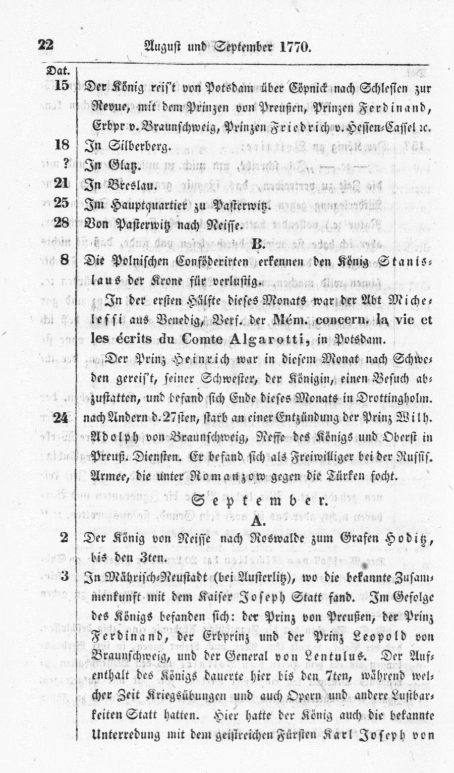 In Mährisch-Neustadt (bei Austerlitz), wo die bekannte Zusammenkunft mit dem Kaiser Joseph Statt fand. Im Gefolge des Königs befanden sich : der Prinz von Preußen, der Prinz Ferdinand, der Erbprinz und der Prinz Leopold von Braunschweig, und der General von Lentulus. Der Aufenthalt des Königs dauerte hier bis den 7ten, während welcher Zeit Kriegsübungen und auch Opern und andere Lustbarkeiten Statt hatten. Hier hatte der König auch die bekannte Unterredung mit dem geistreichen Fürsten Karl Joseph von