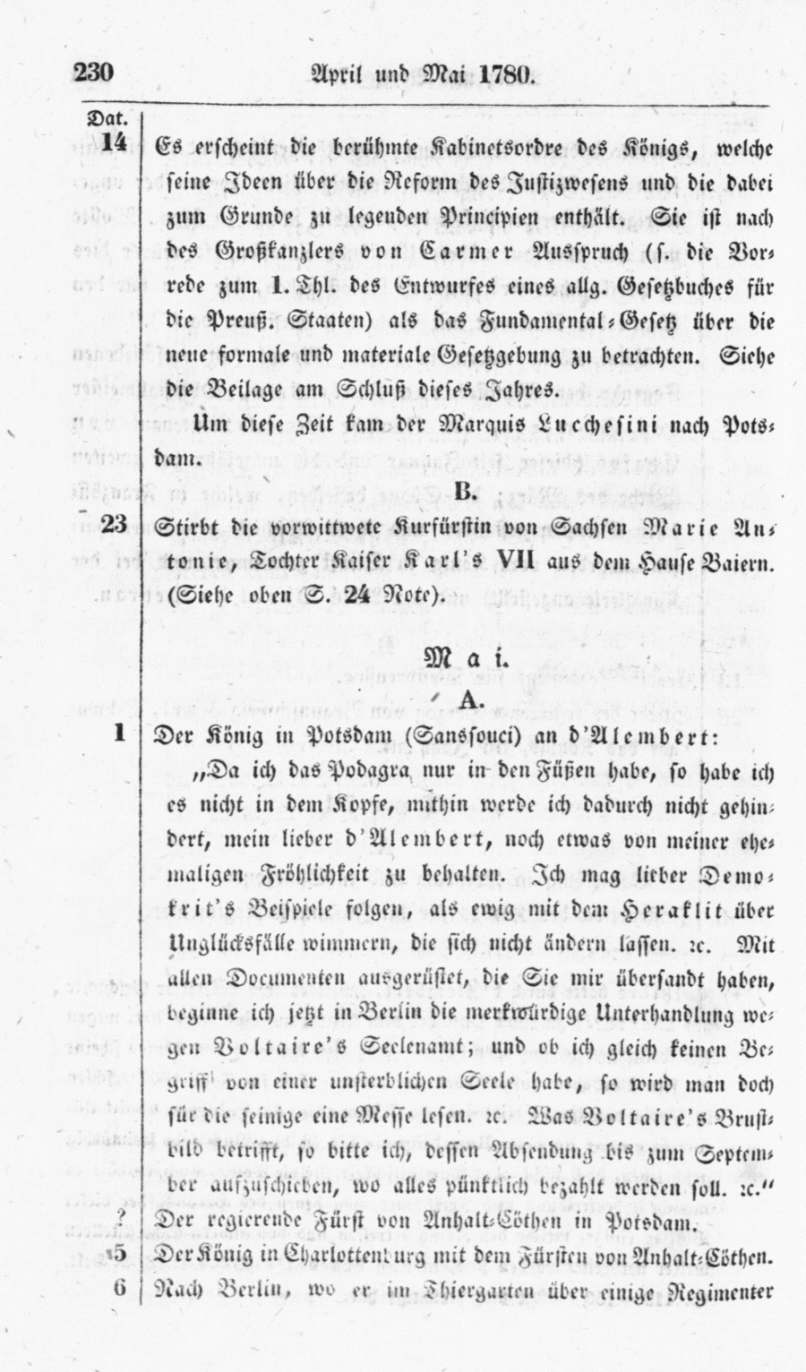 Der König in Potsdam (Sanssouci) an d'Alembert: "Da ich das Podagra nur in den Füßen habe, so habe ich es nicht in dem Kopfe, mithin werde ich dadurch nicht gehindert, mein lieber d'Alembert, noch etwas von meiner ehemaligen Fröhlichkeit zu behalten. Ich mag lieber Demotrit's Beispiele folgen, als ewig mit dem Heraklit über Unglücksfälle wimmern, die sich nicht ändern lassen. etc. Mit allen Documenten ausgerüstet, die Sie mir übersandt haben, beginne ich jetzt in Berlin die merkwürdige Unterhandlung wegen Voltaire's Seellenamt; und ob ich gleich keinen Begriff von einer unsterblichen Seele habe, so wird man doch für die seinige eine Messe lesen. etc. Was Voltaire's Brustbild trifft, so bitte ich, dessen Absendung bis zum September aufzuschieben, wo alles püntklich, bezahlt werden soll. etc."