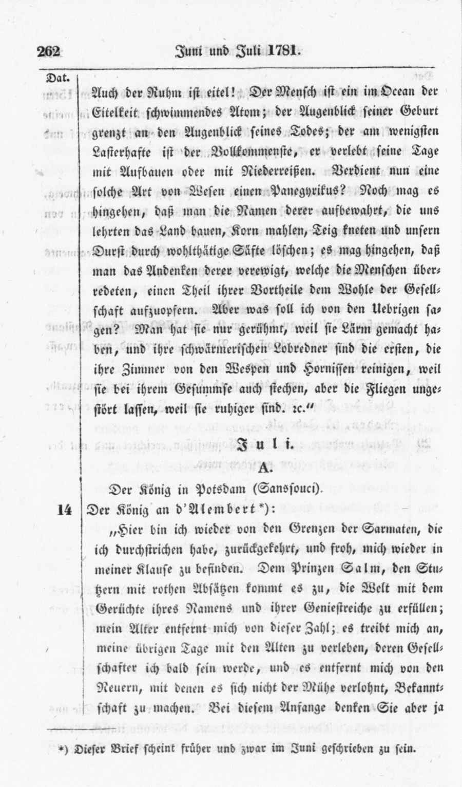 Der König an d' Alembert +: "Hier bin ich wieder von den Grenzen der Sarmaten, die ich durchstrichen habe, zurückgekehrt, und froh, mich wieder in meiner Klause zu befinden. Dem Prinzen Salm, den Stutzern mit rothen Absätzen kommt es zu, die Welt mit dem Gerüchte ihres Namens und ihrer Geniestreiche zu erfüllen; mein Alter entfernt mich von dieser Zahl; es treibt mich an, meine übrigen Tage mit den Alten zu verleben, deren Gesellschafter lch bald sein werde, und es entfernt mich von den Reuer, mit denen es sich nicht der Mühe verlohnt, Bekanntschaft zu machen. Bei diesem Anfange denken Sie aber ja"