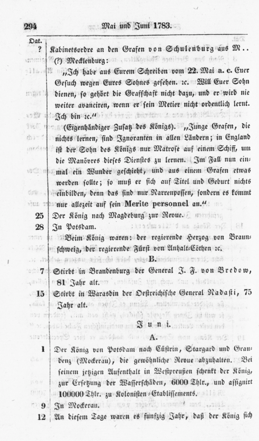 (Eigenhändiger Zusatz des Königs). "Junge Grafen, die nichts lernen, sind Ignoranten in allen Ländern; in England ist der Sohn des Königs nur Matrose auf einem Schiff, um die Manövres dieses Dienstes zu lernen. Im Fall nun einmal ein Wunder geschieht, und aus einem Grafen etwas werden sollte; so muß er sich auf Titel und Geburt nichts einbilden, denn das sind nur Narrenpossen, sondern es kommt nur allezeit auf sein Merite personnel an."