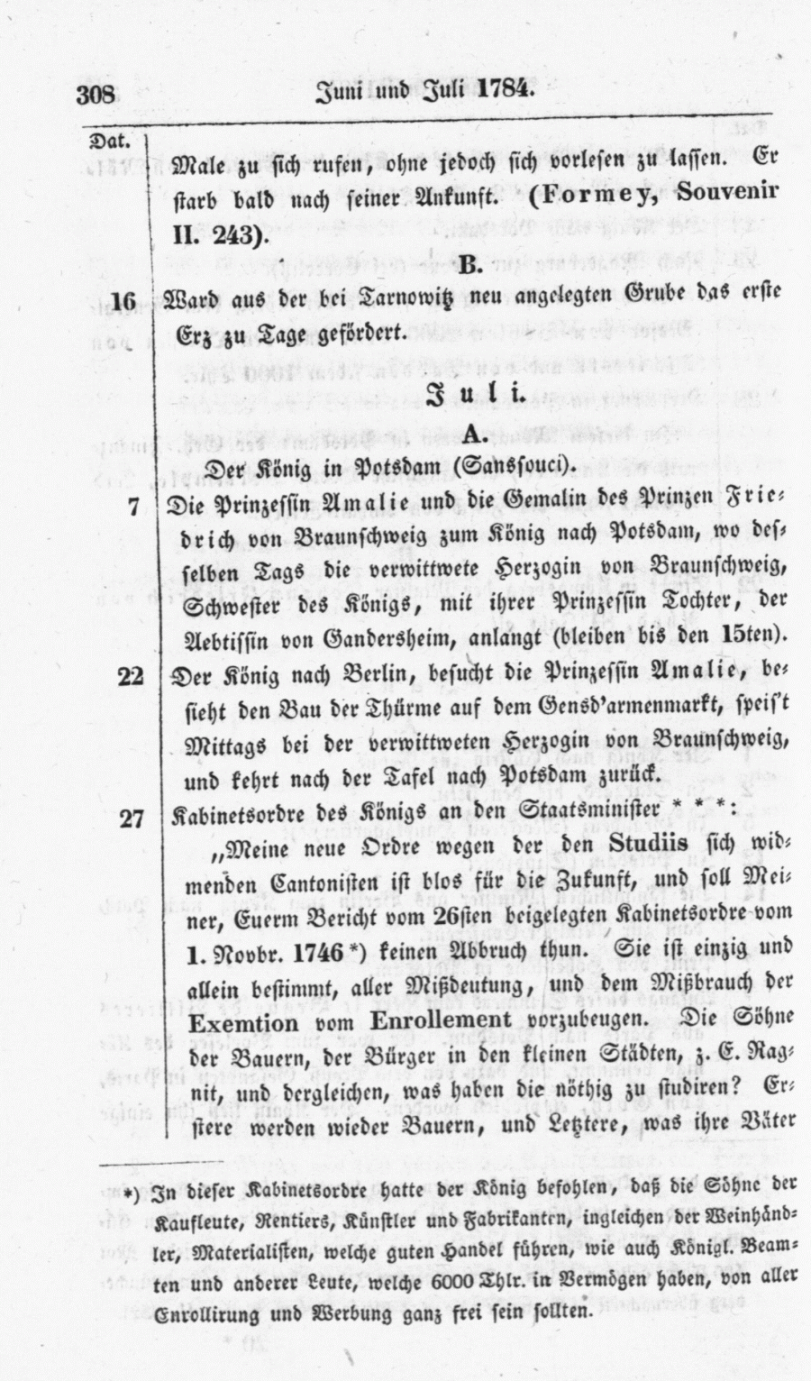 + In dieser Kabinetsordre hatte der König befohlen, daß die Söhne der Kaufleute, Rentiers, Künstler und Fabrikanten, ingleichen der Weinhändler, Materialisten, welche guten Handel führen, wie auch Königl. Beamten und anderer Leute, welche 6000 Thlr. in Vermögen haben, von aller Enrollirung und Werbung ganz frei sein sollten.