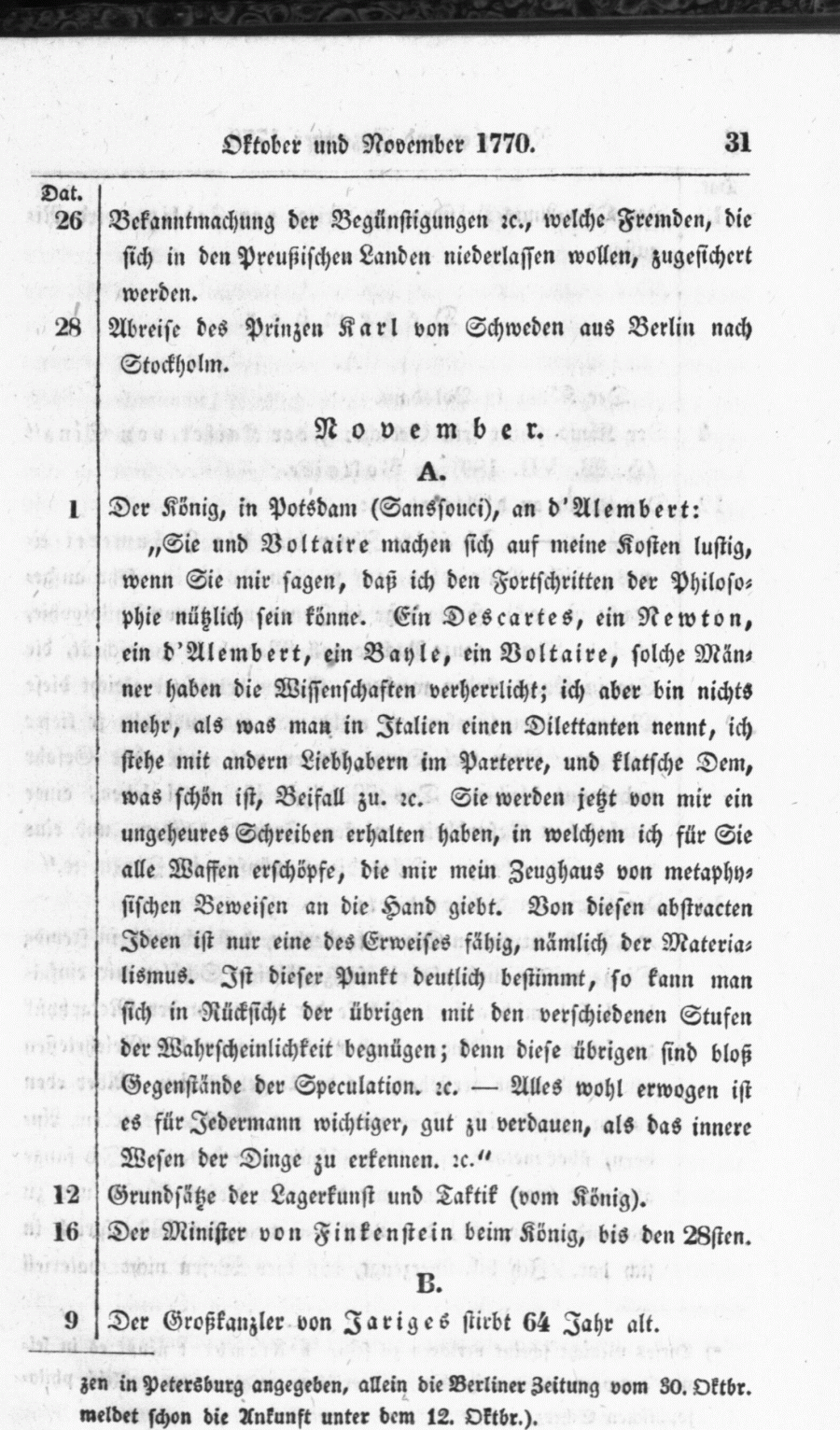 "Sie und Voltaire machen sich auf meine Kosten lustig, wenn Sie mir sagen, daß ich den Fortschritten der Philosophie nützlich sein könne. Ein Descartes, ein Newton, ein d'Alembert, ein Bayle, ein Voltaire, solche Männer haben die Wissenschaften verherrlicht; ich aber bin nichts mehr, als was man in Italien einen Dilettanten nennt, ich stehe mit andern Liebhabern im Parterre, und klatsche Dem, was schön ist, Beifall zu. etc. Sie werden jetzt von mir ein ungeheures Schreiben erhalten haben, in welchem ich für Sie alle Waffen erschöpfe, die mir mein Zeughaus von metaphysischen Beweisen an die Hand giebt. Von diesen abstracten Ideen ist nur eine des Erweises fähig, nämlich der Materialismus. Ist dieser Punkt deutlich bestimmt, so kann man sich in Rücksicht der übrigen mit den verschiedenen Stufen der Wahrscheinlichkeit begnügen; denn diese übrigen sind bloß Gegenstände der Speculation. etc. - Alles wohl erwogen ist es für Jedermann wichtiger, gut zu verdauen, als das innere Wesen der Dinge zu erkennen. etc."