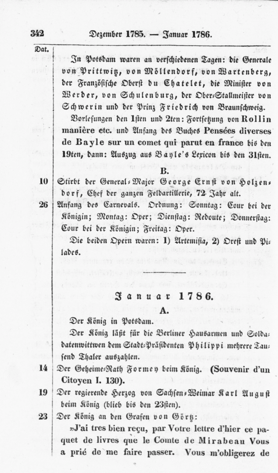 Anfang des Carnevals. Ordnung: Sonntag: Cour bei der Königin; Montag: Oper; Dienstag: Redoute; Donnerstag: Cour bei der Königin; Freitag: Oper. Die beiden Opern waren: 1) Artemisia, 2) Orest und Pilades.