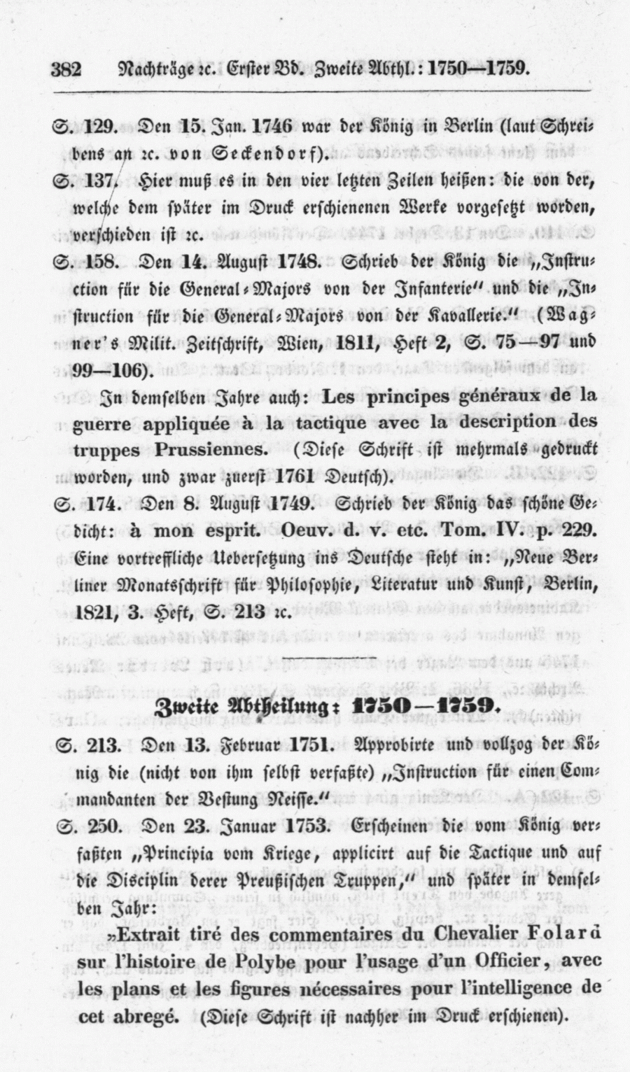 S. 158. Den 14. August 1748. Schrieb der König die "Instruction für die General-Majors von der Infanterie" und die "Instruction für die General-Majors von der Kavallerie." (Wagner's Milit. Zeitschrift, Wien, 1811, Heft 2, S. 75-97 und 99-106).