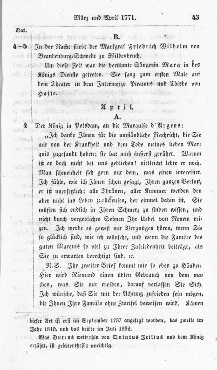 "Ich danke Ihnen für die umständliche Nachricht, die Sie mir von der Krankheit und dem Tode meines lieben Marquis zugesandt haben; sie hat mich äußerst gerührt. Warum ist er doch nicht bei uns geblieben! vielleicht lebte er noch. Man schmeichelt sich gern mit dem, was einen interessirt. Ich fühle, wie ich Ihnen schon gesagt, Ihren ganzen Verlust, er ist unersetzlich; alle Thränen, aller Kummer werden den aber nicht ins Leben zurückrufen, der einmal dahin ist. Sie müssen sich endlich in Ihren Schmerz zu finden wissen, und nicht durch vergebliches Sehnen Ihr Uebel von Neuem reizen. Ich werde es gewiß mit Vergnügen hören, wenn Sie so glücklich sind, wie ich wünsche, und wenn die Familie des guten Marquis so viel zu Ihrer Zufriedenheit beiträgt, als Sie zu erwarten berechtigt sind. etc.