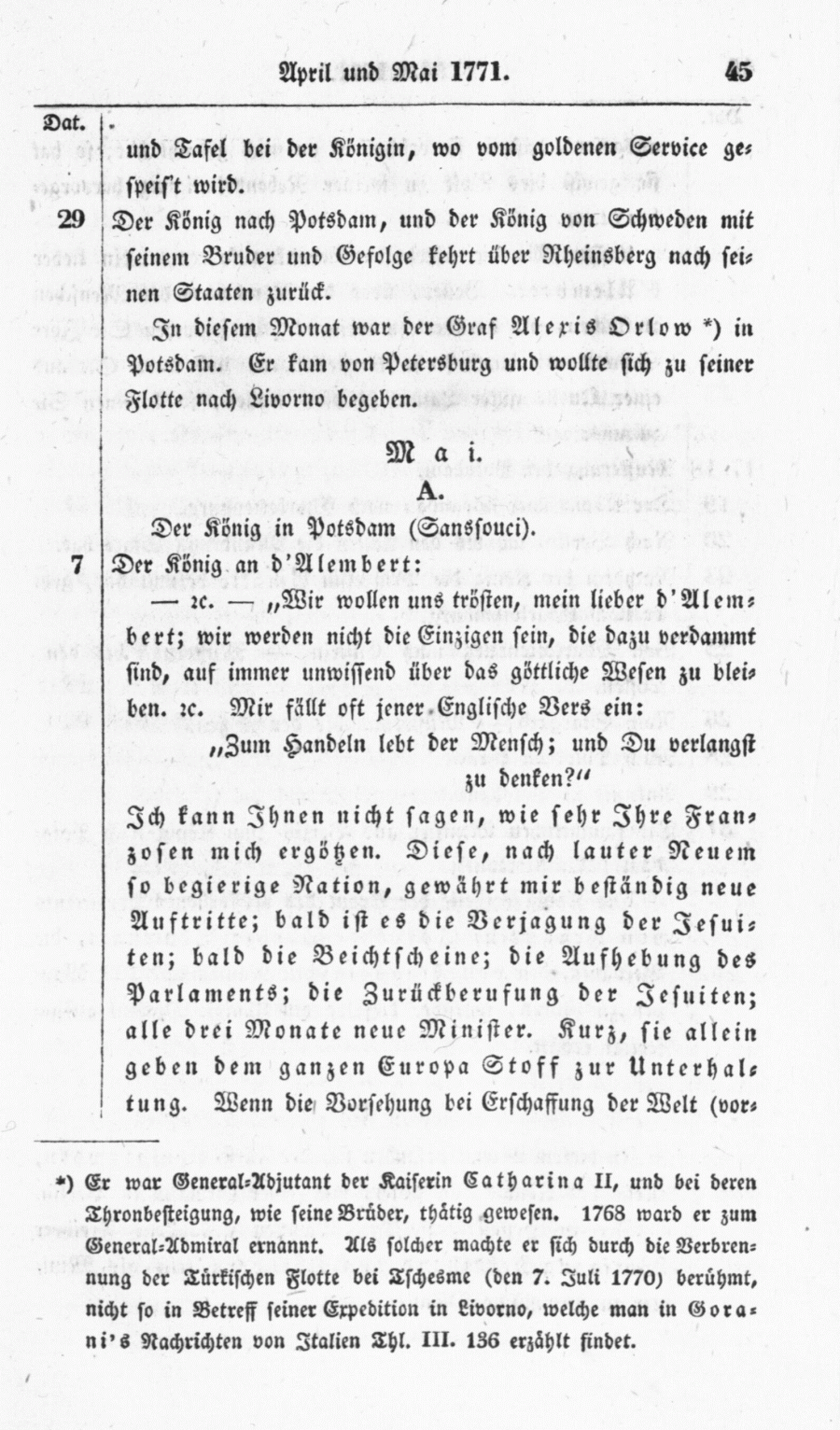 In diesem Monat war der Graf Alexis Orlow + in Potsdam. Er kam von Petersburg und wollte sich zu seiner Flotte nach Livorno begeben.