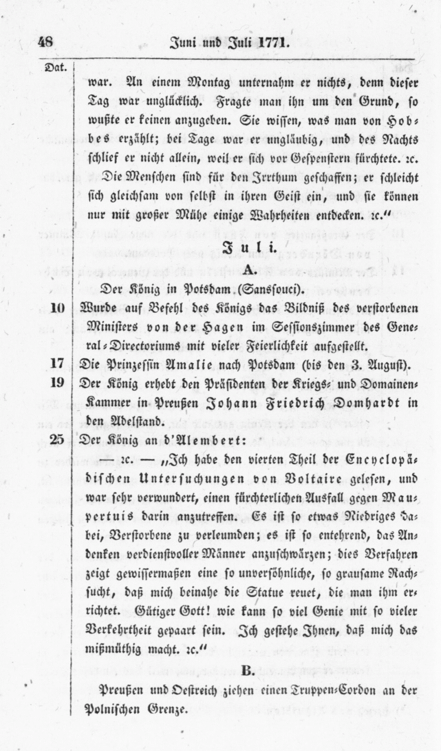 - etc. - "Ich habe den vierten Theil der Encyclopädischen Untersuchungen von Voltaire gelesen, und war sehr verwundert, einen fürchterlichen Ausfall gegen Maupertuis darin anzutreffen. Es ist so etwas Niedriges dabei, Verstorbene zu verleumden; es ist so entehrend, das Andenken verdienstvoller Männer anzuschwärzen; dies Verfahren zeigt gewissermaßen eine so unversöhnliche, so grausame Rachsucht, daß mich beinahe die Statue reuet, die man ihm errichtet. Gütiger Gott! wie kann so viel Genie mit so vieler Verkehrtheit gepaart sein. Ich gestehe Ihnen, daß mich das mißmüthig macht. etc."