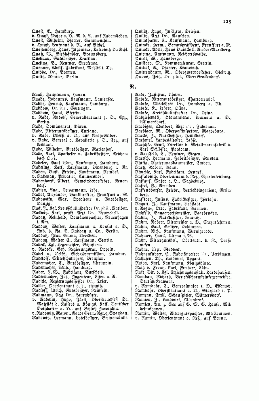 - Raddatz, Walter, Kaufmann u. Konsul a. D., Inh. d. Fa. P. Raddatz u. Co., Berlin.
