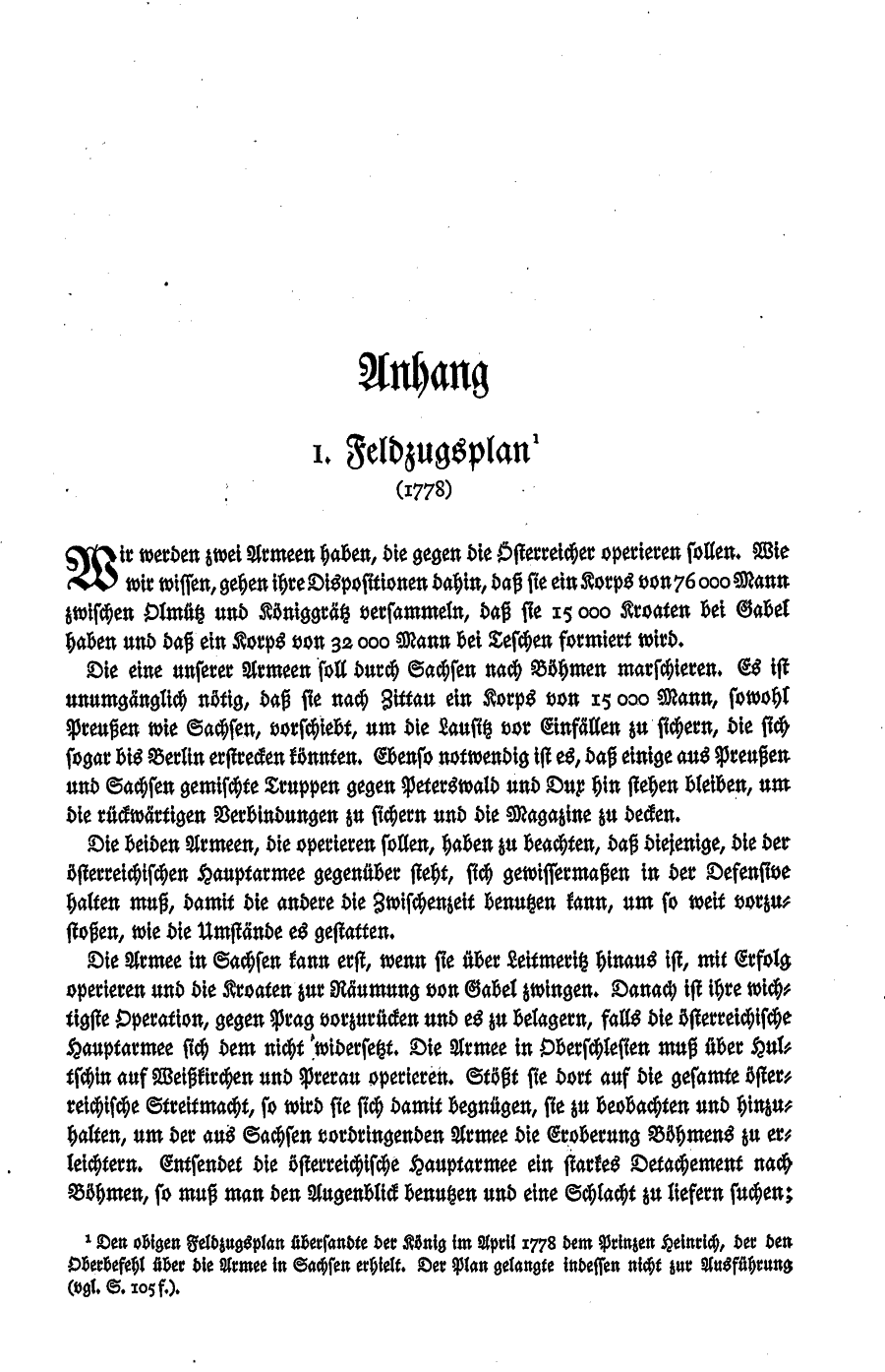 1 Den obigen Feldzugsplan übersandte der König im April 1778 dem Prinzen Heinrich, der den Oberbefehl über die Armee in Sachsen erhielt. Der Plan gelangte indessen nicht zur Ausführung (vgl. S.105 f.).