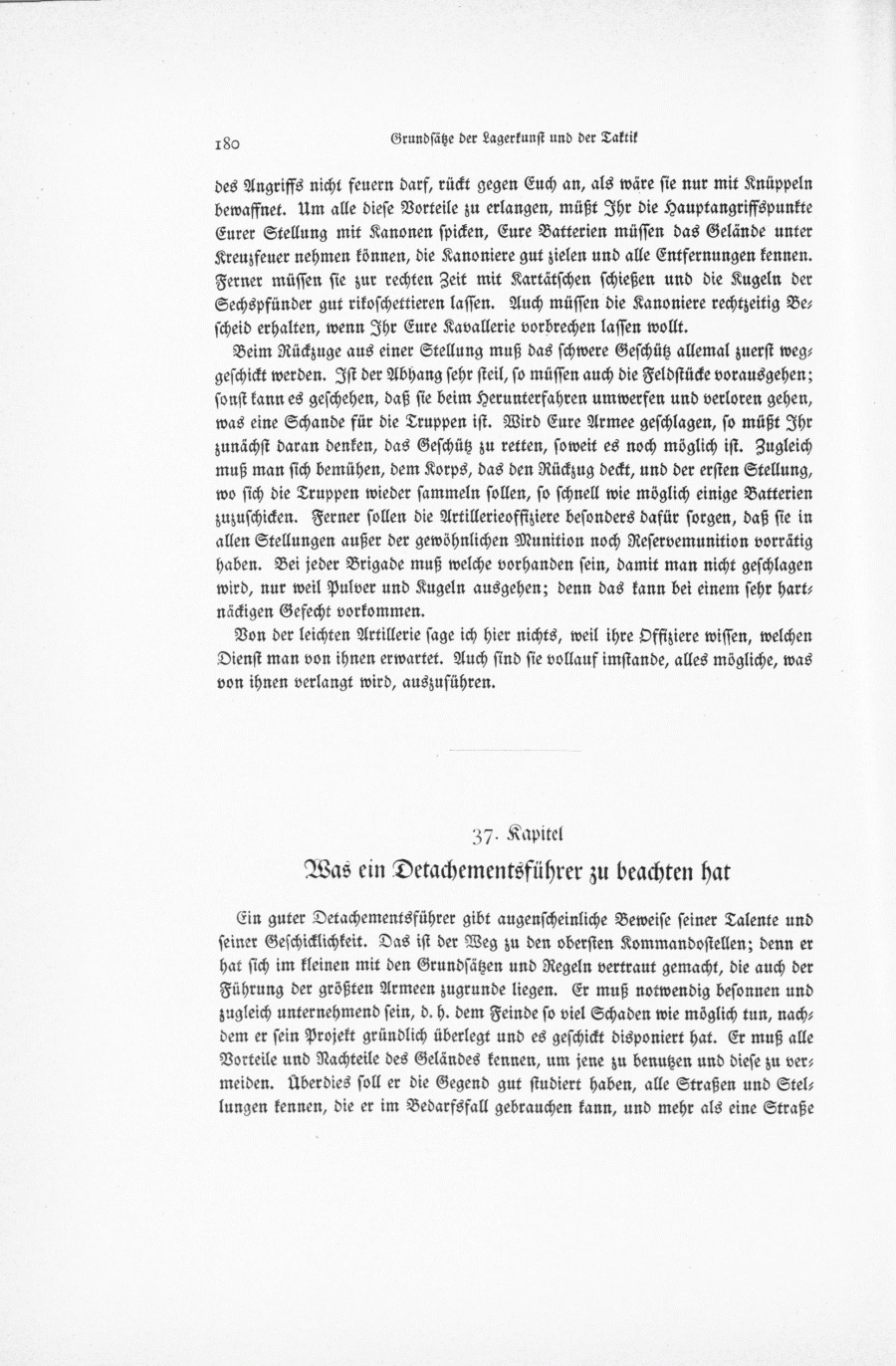 Ein guter Detachementsführer gibt augenscheinliche Beweise seiner Talente und seiner Geschicklichkeit. Das ist der Weg zu den obersten Kommandostellen; denn er hat sich im kleinen mit den Grundsätzen und Regeln vertraut gemacht, die auch der Führung der größten Armeen zugrunde liegen. Er muß notwendig besonnen und zugleich unternehmend sein, d. h. dem Feinde so viel Schaden wie möglich tun, nachdem er sein Projekt gründlich überlegt und es geschickt disponiert hat. Er muß alle Vorteile und Nachteile des Geländes kennen, um jene zu benutzen und diese zu vermeiden. Überdies soll er die Gegend gut studiert haben, alle Straßen und Stellungen kennen, die er im Bedarfsfall gebrauchen kann, und mehr als eine Straße