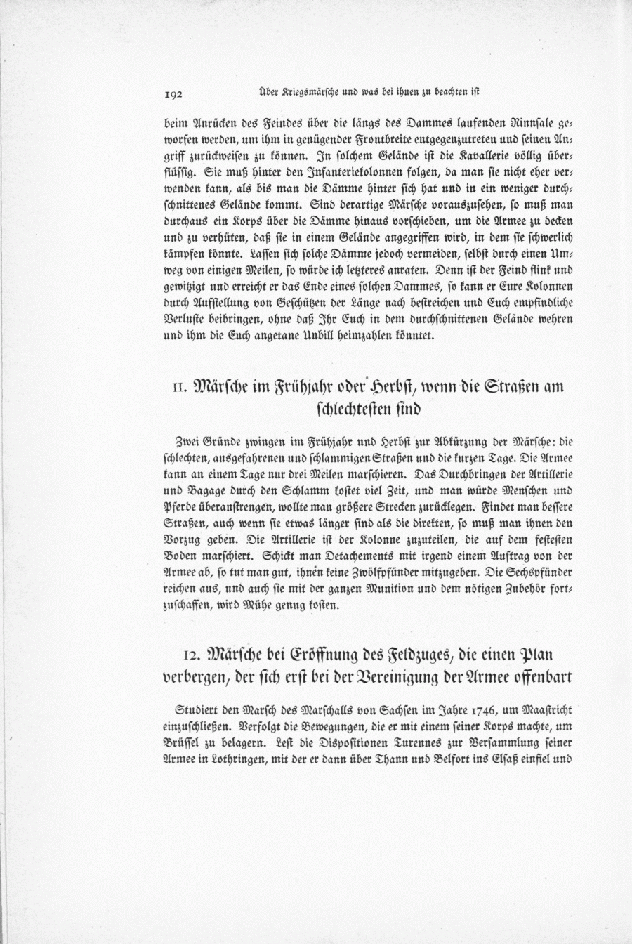 Zwei Gründe zwingen im Flühjahr und Herbst zur Abkürzung der Märsche: die schlechten, ausgefahrenen und schlammigen Straßen und die kurzen Tage. Die Armee kann an einem Tage nur drei Meilen marschieren. Das Durchbringen der Artillerie und Bagage durch den Schlamm kostet viel Zeit, und man würde Menschen und Pferde überanstrengen, wollte man größere Strecken zurücklegen. Findet man bessere Straßen, auch wenn sie etwas länger sind als die direkten, so muß man ihnen den Vorzug geben. Die Artillerie ist der Kolonne zuzuteilen, die auf dem festesten Boden marschiert. Schickt man Detachements mit irgend einem Auftrag von der Armee ab, so tut man gut, ihnen keine Zwölfpfünder mitzugeben. Die Sechspfünder reichen aus, und auch sie mit der ganzen Munition und dem nötigen Zubehör fortzuschaffen, wird Mühe genug kosten.