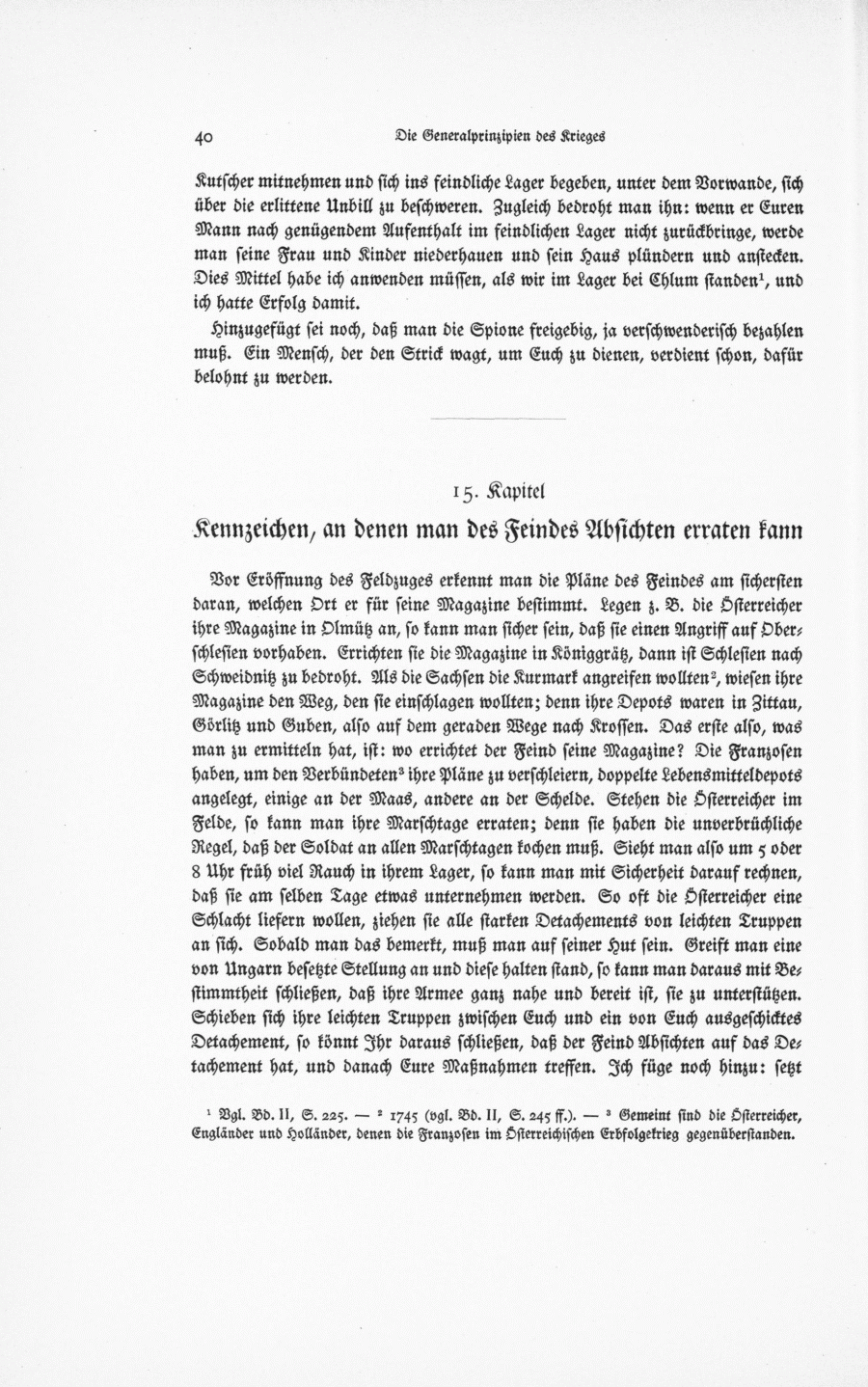Vor Eröffnung des Feldzuges erkennt man die Pläne des Feindes am sichersten daran, welchen Ort er für seine Magazine bestimmt. Legen z. B. die Österreicher ihre Magazine in Olmütz an, so kann man sicher sein, daß sie einen Angriff auf Oberschlesien vorhaben. Errichten sie die Magazine in Königgrätz, dann ist Schlesien nach Schweidnitz zu bedroht. Als die Sachsen die Kurmark angreifen wollten2, wiesen ihre Magazine den Weg, den sie einschlagen wollten; denn ihre Depots waren in Zittau, Görlitz und Guben, also auf dem geraden Wege nach Krossen. Das erste also, was man zu ermitteln hat, ist: wo errichtet der Feind seine Magazine? Die Franzosen haben, um den Verbündeten3 ihre Pläne zu verschleiern, doppelte Lebensmitteldepots angelegt, einige an der Maas, andere an der Scheide. Stehen die österreicher im Felde, so kann man ihre Marschtage erraten; denn sie haben die unverbrüchliche Regel, daß der Soldat an allen Marschtagen kochen muß. Sieht man also um 5 oder 8 Uhr früh viel Rauch in ihrem Lager, so kann man mit Sicherheit darauf rechnen, daß sie am selben Tage etwas unternehmen werden. So oft die Österreicher eine Schlacht liefern wollen, ziehen sie alle starten Detachements von leichten Truppen an sich. Sobald man das bemerkt, muß man auf seiner Hut sein. Greift man eine von Ungarn besetzte Stellung an und diese halten stand, so kann man daraus mit Bestimmtheit schließen, daß ihre Armee ganz nahe und bereit ist, sie zu unterstützen. Schieben sich ihre leichten Truppen zwischen Euch und ein von Euch ausgeschicktes Detachement, so könnt Ihr daraus schließen, daß der Feind Absichten auf das Detachement hat, und danach Eure Maßnahmen treffen. Ich füge noch hinzu: setzt