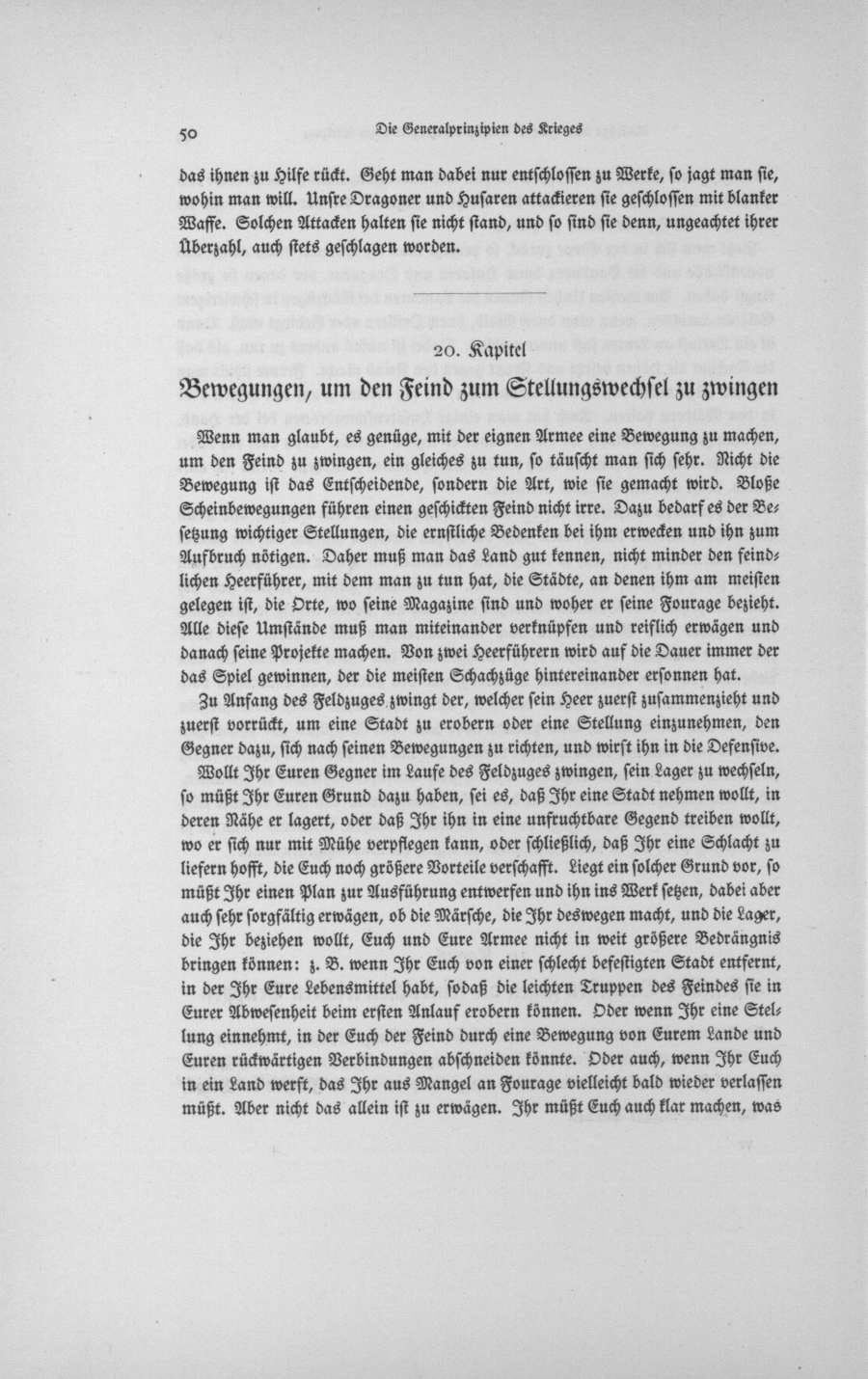 Wenn man glaubt, es genüge, mit der eignen Armee eine Bewegung zu machen, um den Feind zu zwingen, ein gleiches zu tun, so täuscht man sich sehr. Nicht die Bewegung ist das Entscheidende, sondern die Art, wie sie gemacht wird. Bloße Scheinbewegungen führen einen geschickten Feind nicht irre. Dazu bedarf es der Besetzung wichtiger Stellungen, die ernstliche Bedenken bei ihm erwecken und ihn zum Aufbruch nötigen. Daher muß man das Land gut kennen, nicht minder den feindlichen Heerführer, mit dem man zu tun hat, die Städte, an denen ihm am meisten gelegen ist, die Orte, wo seine Magazine sind und woher er seine Fourage bezieht. Alle diese Umstände muß man miteinander verknüpfen und reiflich erwägen und danach seine Projekte machen. Von zwei Heerführern wird auf die Dauer immer der das Spiel gewinnen, der die meisten Schachzüge hintereinander ersonnen hat.