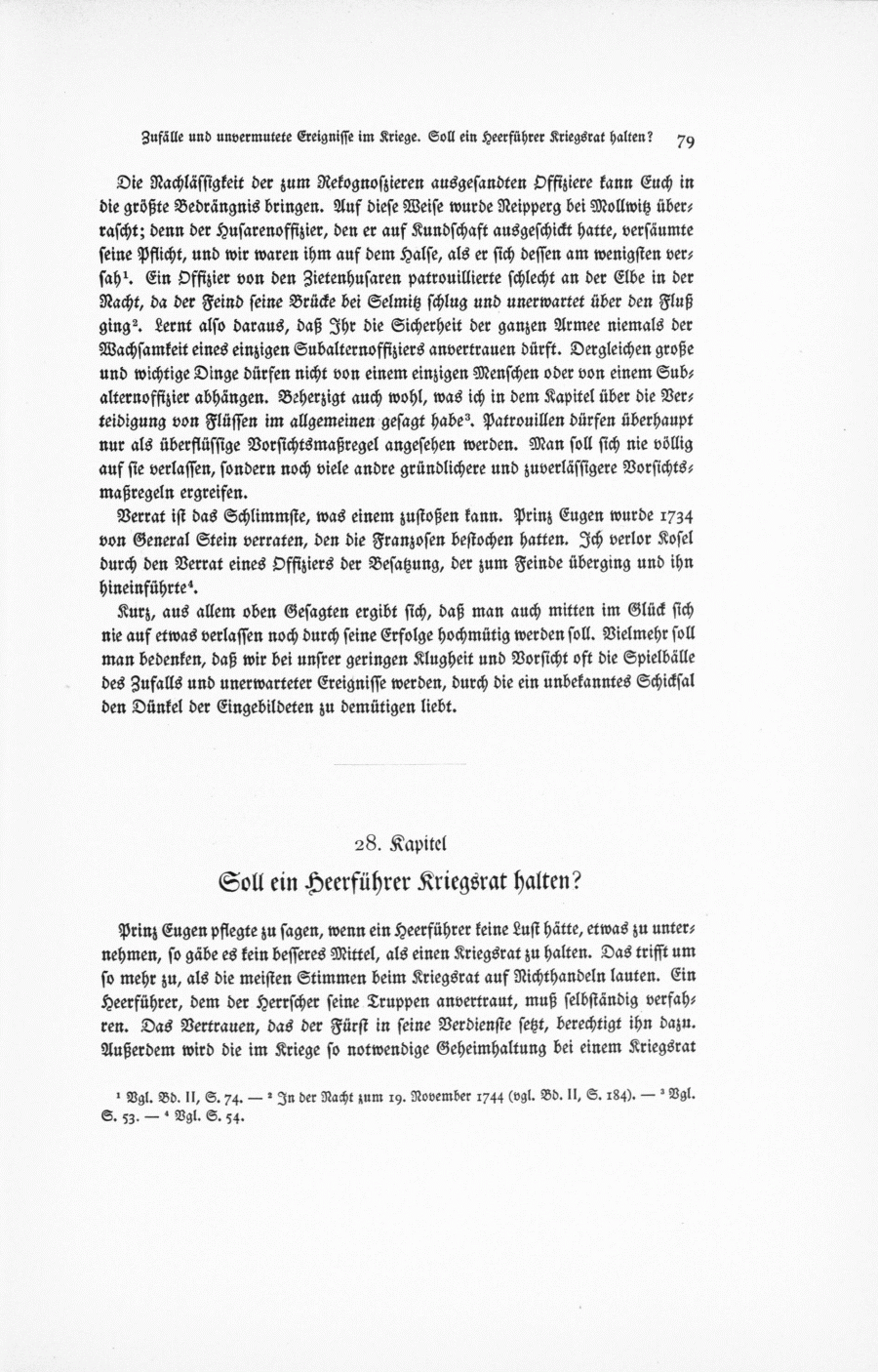 Prinz Eugen pflegte zu sagen, wenn ein Heerführer keine Lust hätte, etwas zu unternehmen, so gäbe es kein besseres Mittel, als einen Kriegsrat zu halten. Das trifft um so mehr zu, als die meisten Stimmen beim Kriegsrat auf NichtHandeln lauten. Ein Heerführer, dem der Herrscher seine Truppen anvertraut, muß selbständig verfahren. Das Vertrauen, das der Fürst in seine Verdienste setzt, berechtigt ihn dazu. Außerdem wird die im Kriege so notwendige Geheimhaltung bei einem Kriegsrat