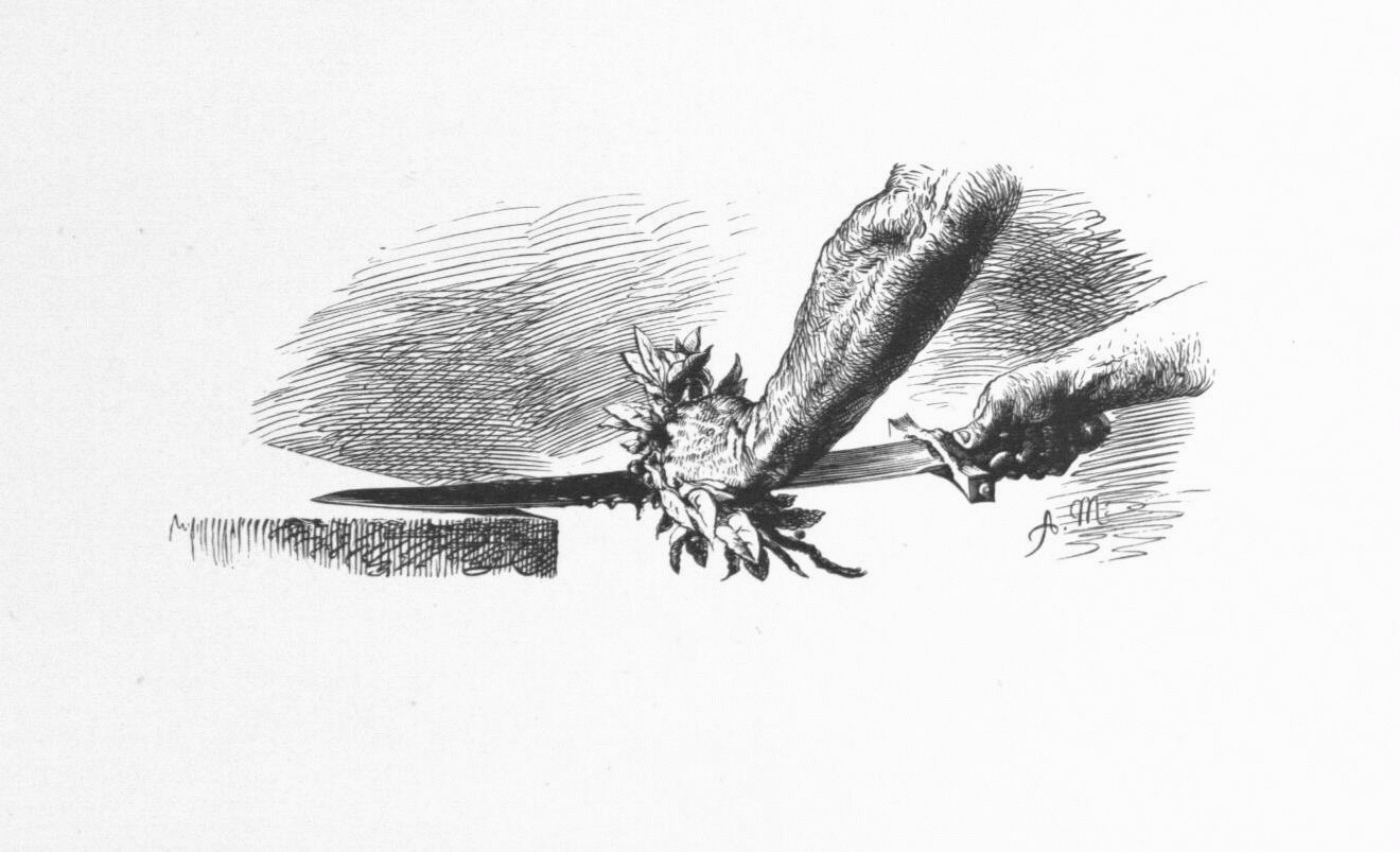 16. Un guerrier essuie d'une main, avec une touffe de lauriers, le sang de la lame d'une épée dont l'autre main serre la poignée. (Chapt. VI de l'„Histoire de mon temps“. - Gravure d'Unzelmann.)