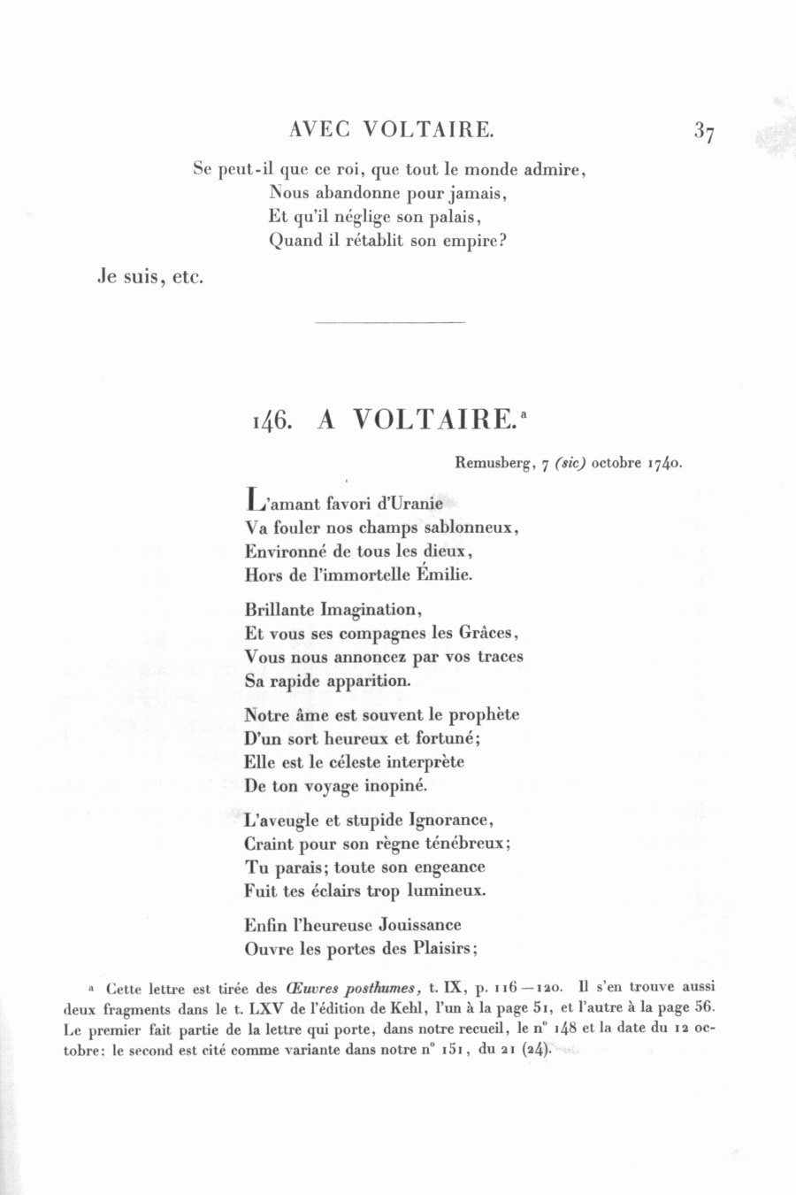 a Cette lettre est tirée des Œuvres posthumes, t. IX, p. 116-120. Il s'en trouve aussi deux fragments dans le t. LXV de l'édition de Kehl, l'un à la page 51, et l'autre à la page 56. Le premier fait partie de la lettre qui porte, dans notre recueil, le no 148 et la date du 12 octobre : le second est cité comme variante dans notre no 151, du 21 (24).