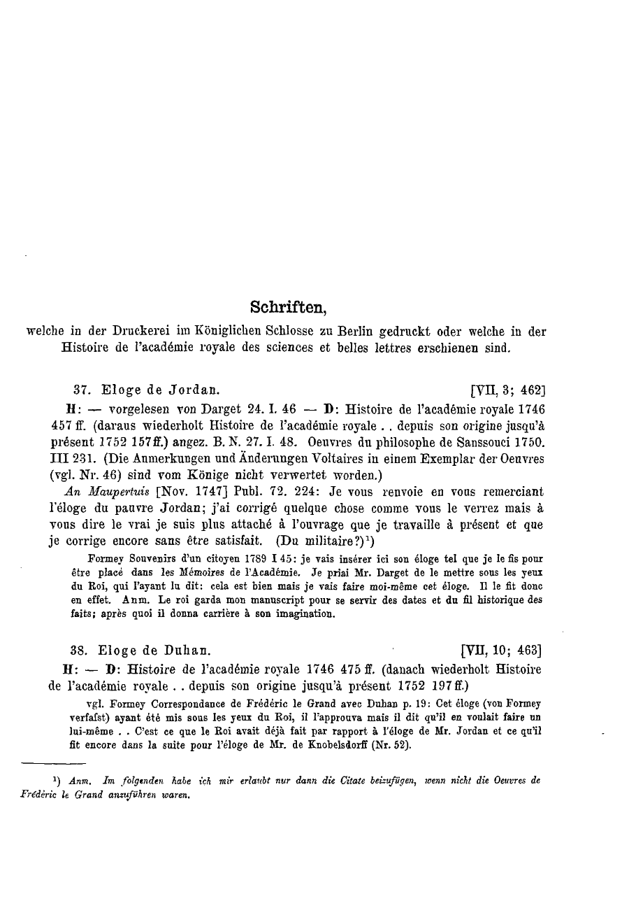 Formey Souvenirs d'un citoyen 1789 145 : je vais insérer ici son éloge tel que je le fis pour être placé dans les Mémoires de l'Académie. Je priai Mr. Darget de le mettre sous les yeux du Roi, qui l'ayant lu dit : cela est bien mais je vais faire moi-même cet éloge. Il le fit donc en effet. Anm. Le roi garda mon manuscript pour se servir des dates et du fil historique des faits; après quoi il donna carrière à son imagination.