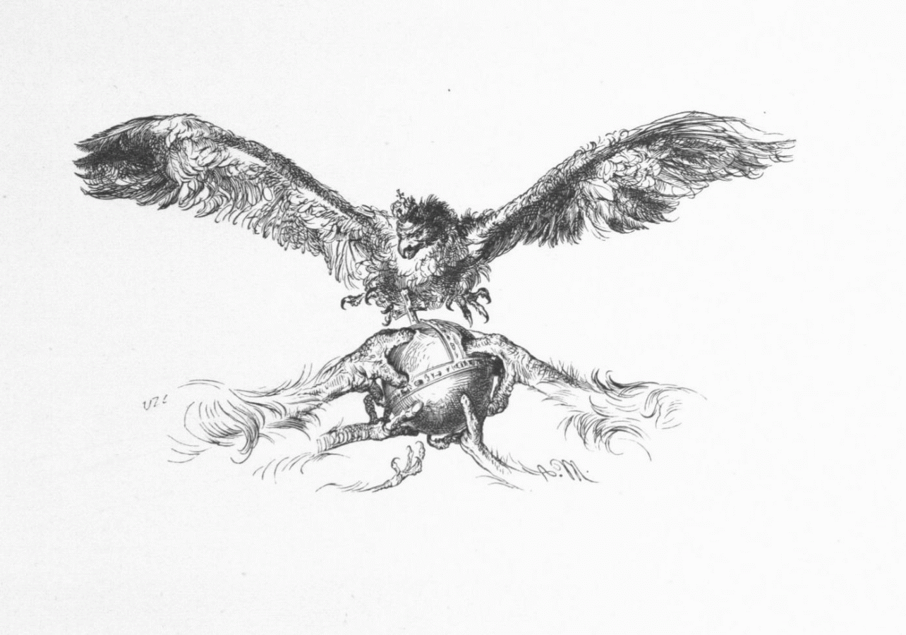 Der preußische Adler schwebt mit ausgebreiteten Flügeln über dem Reichsapfel, in den andere Raubvögel ihre Krallen geschlagen haben.