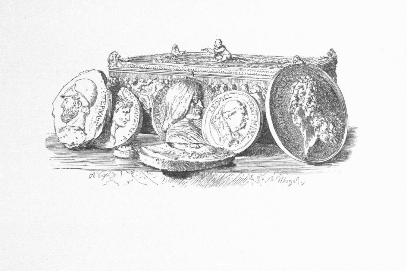 Ein reich verzierter Kasten, an dem Porträtmedaillen des Perikles, Augustus, Lorenzo Magnificos, Leos X. und Ludwigs XIV. hängen. Eine weitere Porträtmedaille liegend im Vordergrund.