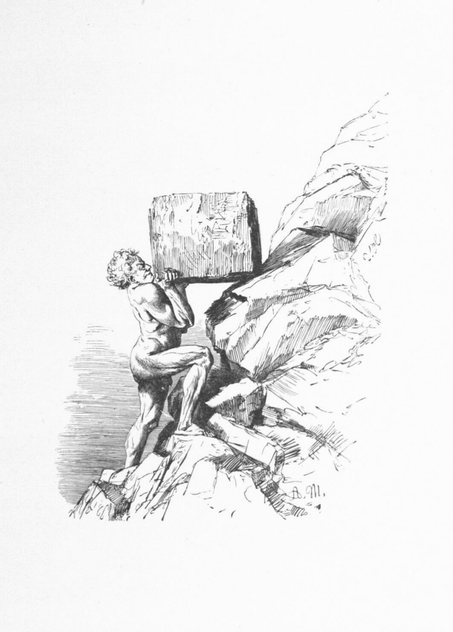 Ein nackter Mann sucht mit Anspannung aller Kräfte einen Steinblock einen Abhang hinaufzuwälzen.