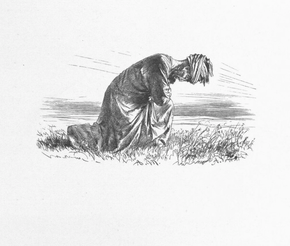 Kniende, bärtige Gestalt mit Turban, zur Sonne hin betend.