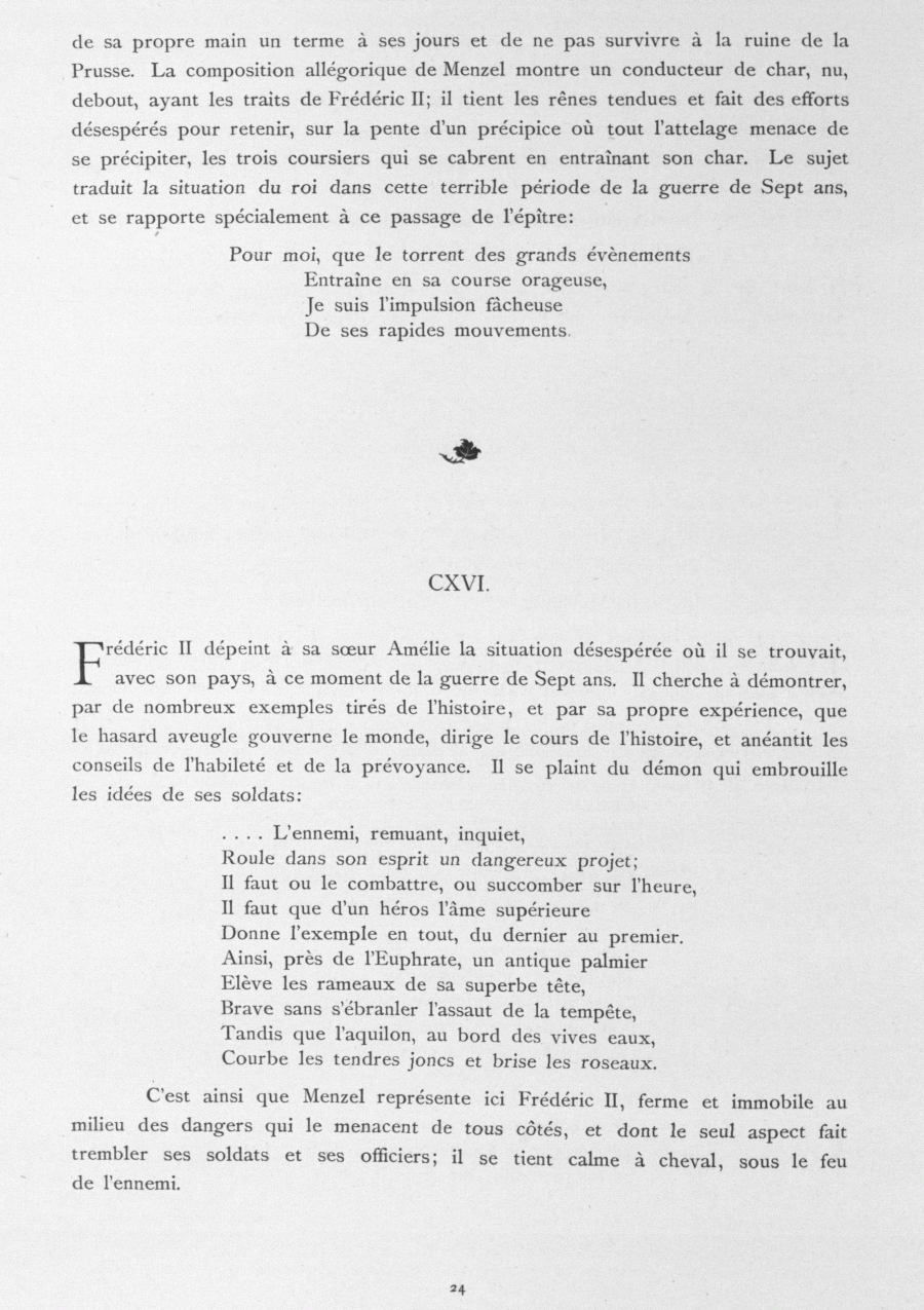 <24>de sa propre main un terme à ses jours et de ne pas survivre à la ruine de la Prusse. La composition allégorique de Menzel montre un conducteur de char, nu, debout, ayant les traits de Frédéric II; il tient les rênes tendues et fait des efforts désespérés pour retenir, sur la pente d'un précipice où tout l'attelage menace de se précipiter, les trois coursiers qui se cabrent en entraînant son char. Le sujet traduit la situation du roi dans cette terrible période de la guerre de Sept ans, et se rapporte spécialement à ce passage de l'épître: